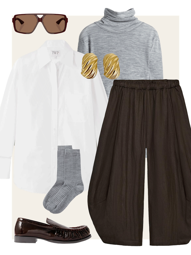 You can’t go wrong with timeless neutrals. Pair brown trousers with a grey roll-neck layered under a crisp white shirt, then finish off with loafers and socks for a preppy, polished feel.