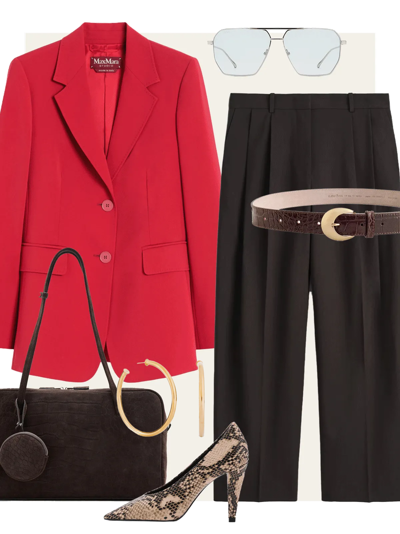 For a chic update, introduce a flash of red. A bold blazer instantly lifts the trousers, while a snake-print shoe adds just the right amount of interest – a confident mix of colour and texture that feels modern and cool.
