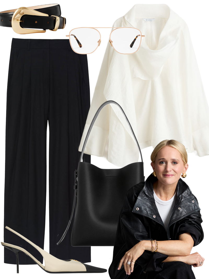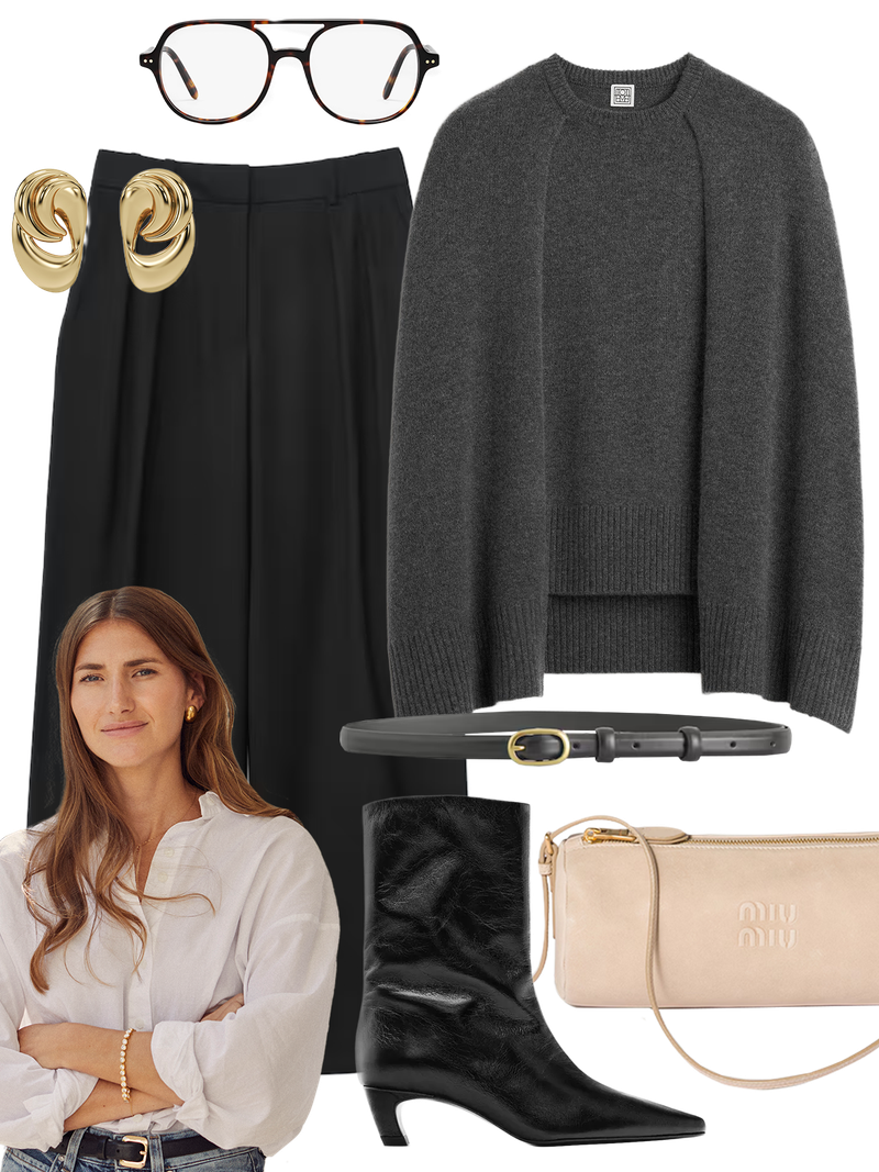 I would opt for a black tailored trouser and a jumper like this one from TOTEME, which is just a bit different. I would keep the accessories simple – you can't go wrong with a black ankle boot – and then I'd complete the look with a small bag and some gold earrings.
