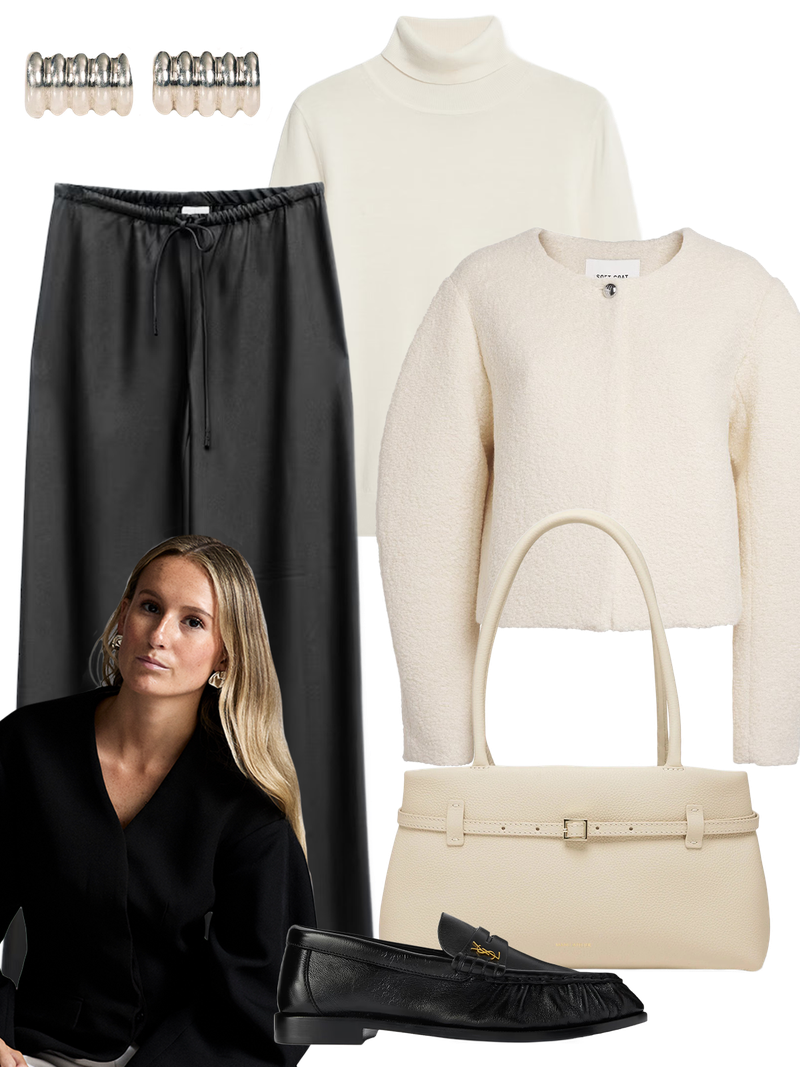 I tend to take a minimalist approach to interviews but I still like to let my personal style shine through. A plain roll-neck paired with satin trousers creates a polished base, which I would modernise with a bouclé collarless blazer rather than a more traditional cut. A bowling bag, loafers a nd statement earrings complete the contemporary look.