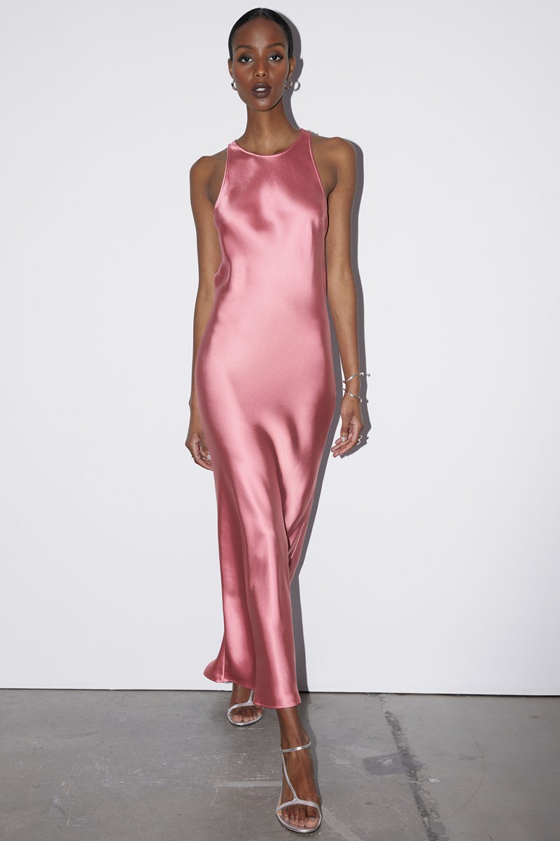 YOU CAN’T GO WRONG with a luxe satin dress – JUST ADD POINTED SLINGBACKS and an embellished cream clutch for further polish.
