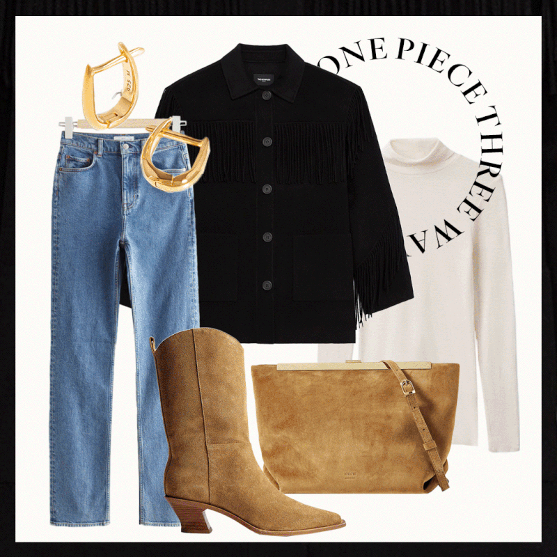 For a daytime look, add stonewashed denim and sandy suede accessories. A simple cream turtleneck and classic gold hoops keep the look clean and fresh.