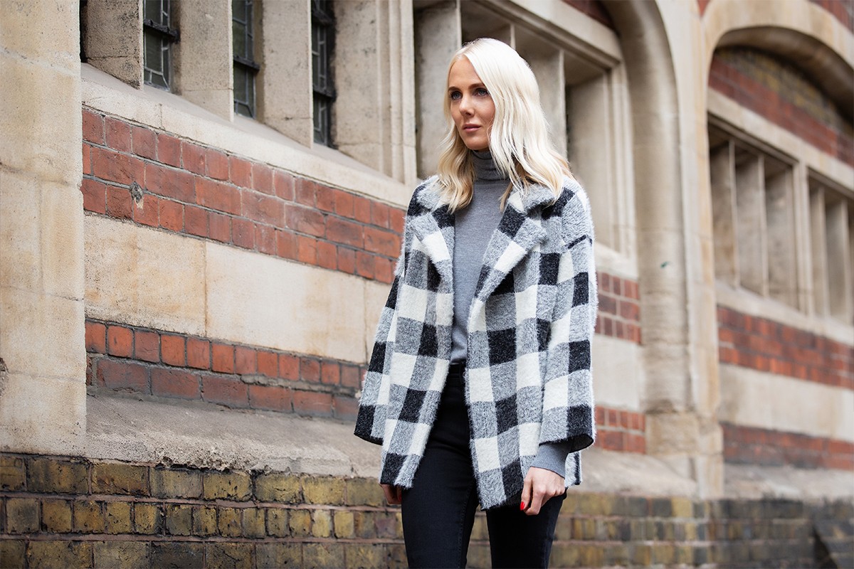 100% Silk Blouse, £69.99 | Structured Houndstooth Coat, £119.99 | Metal Buckle Belt, £12.99 | Soho Skinny Jeans, £35.99