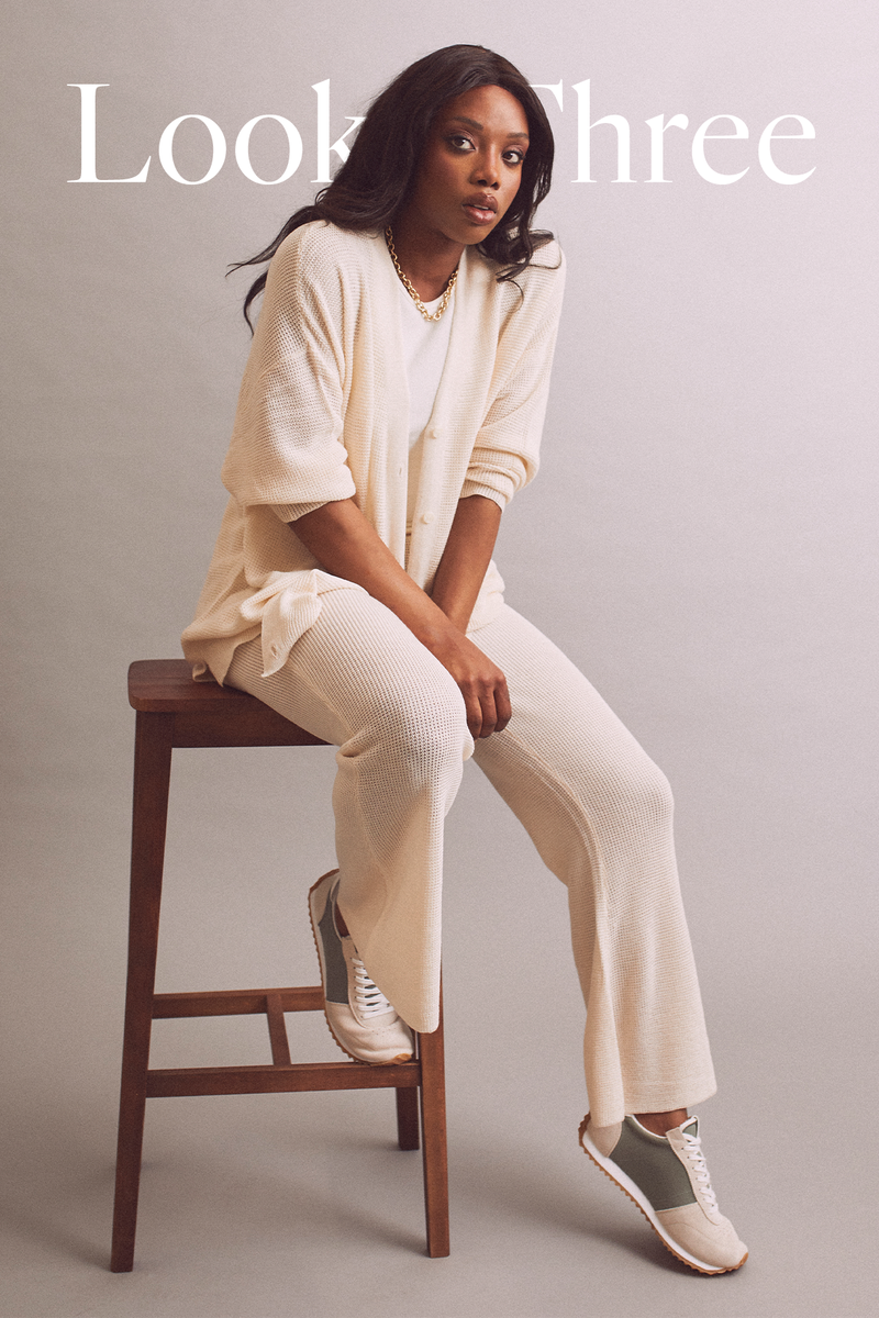 A matching cardi and jogger set feels a bit more elevated than a jersey tracksuit – just add gold jewellery to make it feel more put together.