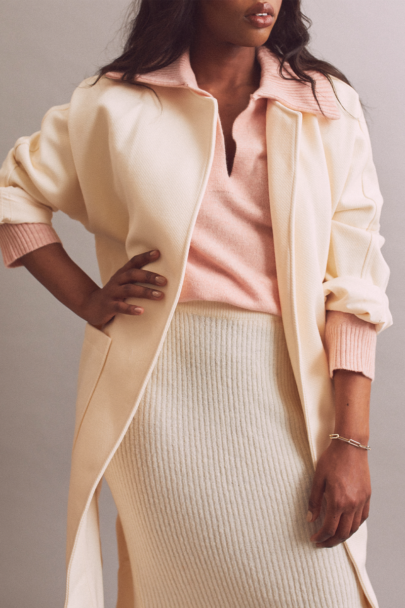 A sweater and knitted skirt is a simple combination – but with the addition of a collar and subtle rib detailing, everything becomes a whole lot more exciting. Throw on a long coat and white boots for a cool, tonal finish.