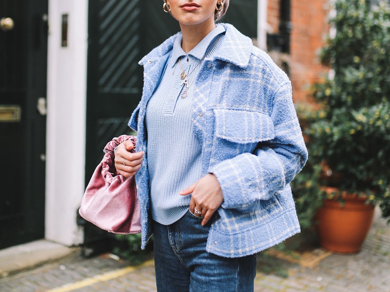 I really love the monochrome look right now; it’s both fun and chic. The Monki check jacket really breaks it up and the pink velvet bag compliments the blue. Perfect for casual, off-duty days.