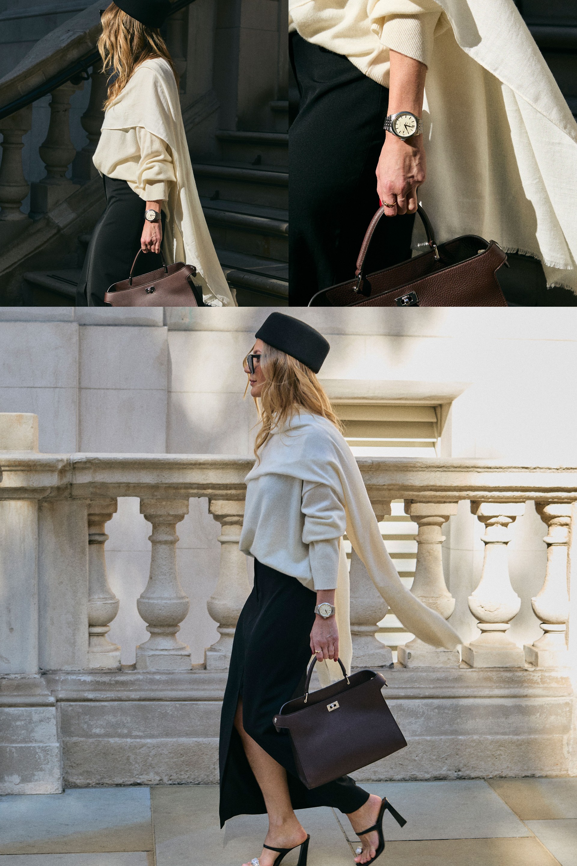 For the first look, I leaned into something that felt timeless yet playful – a pillbox hat paired with a soft cashmere knit, a scarf nonchalantly draped over the shoulders, a tailored pencil skirt and classic heels. It was very much inspired by that vintage, Audrey Hepburn elegance, but I wanted to give it a modern twist. The Seiko Presage watch added that contemporary edge – understated and beautifully crafted. It grounded the look for now, while still feeling utterly timeless.