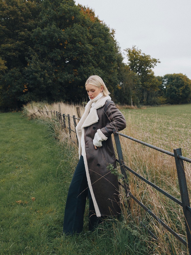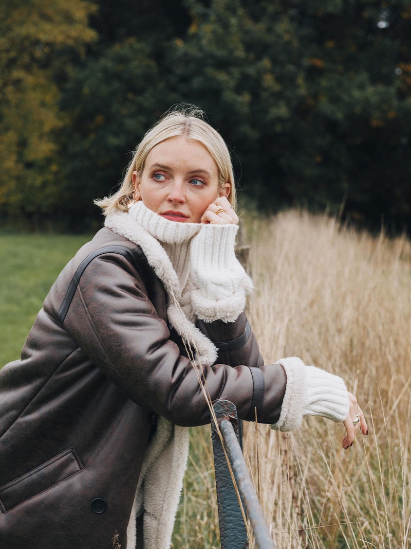 Polly wears Double-Breasted Shearling Coat, £69.50; Cable Knit V Neck Jumper, £25; Seam Detail Wide Leg Jeans, £25