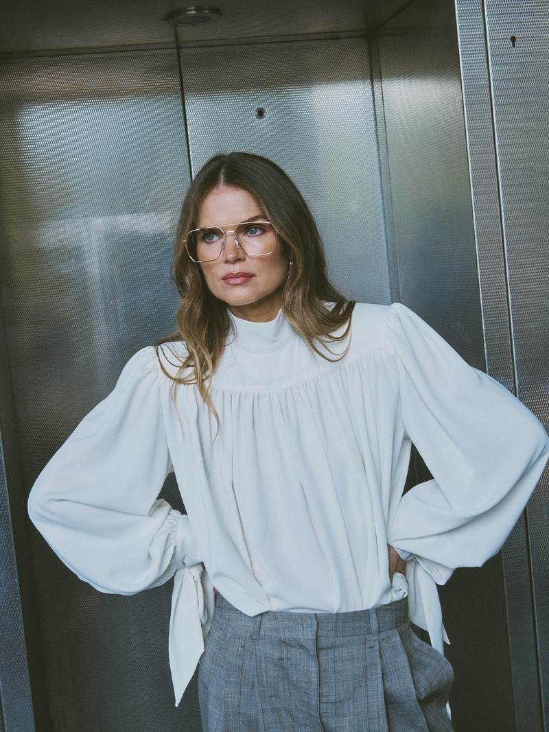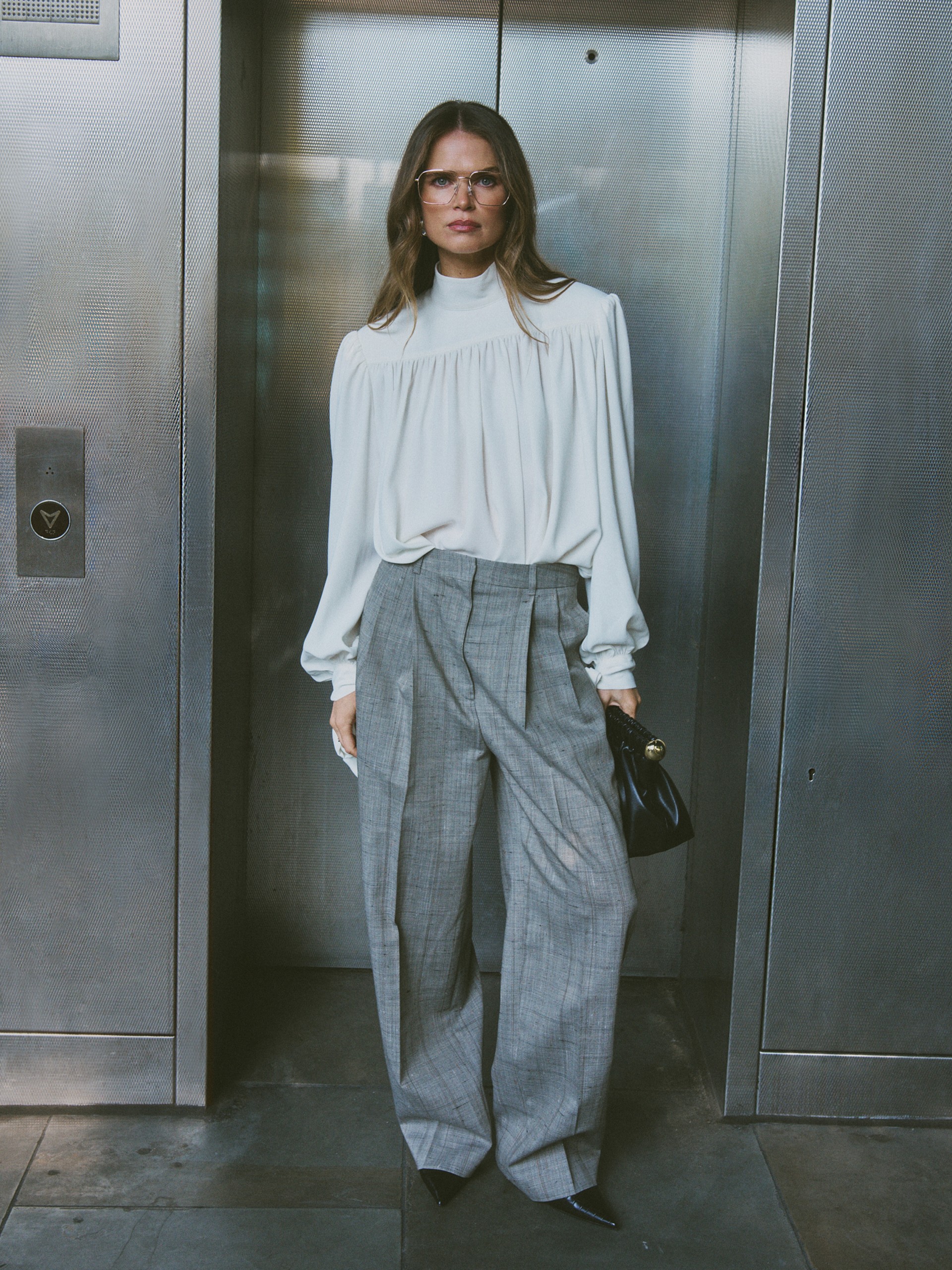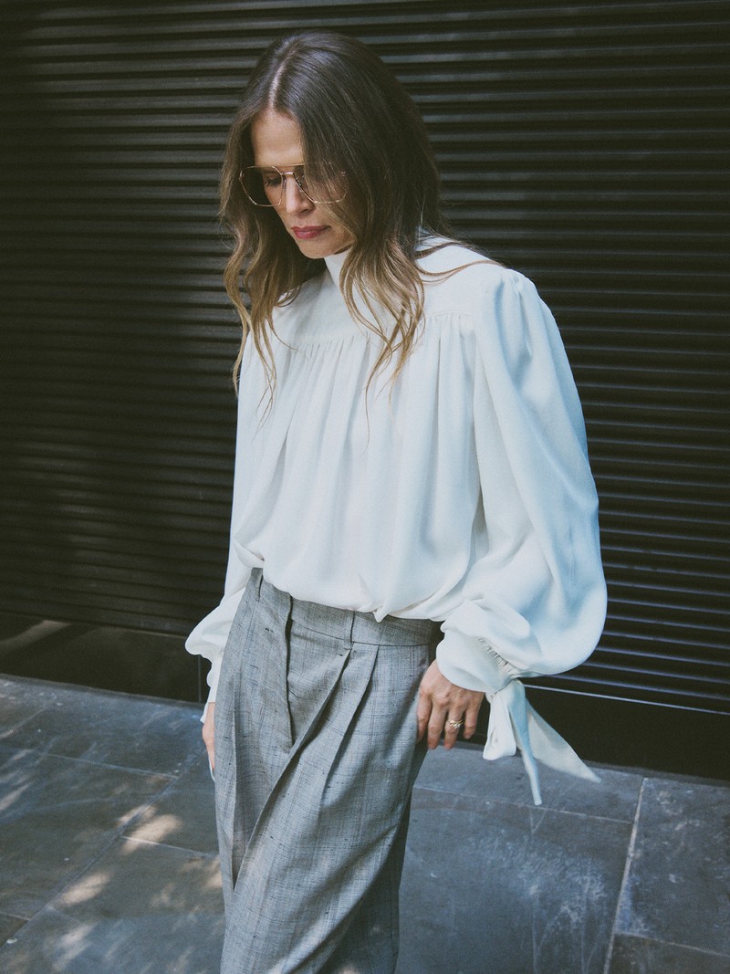 There’s something powerful ABOUT CONTRASTING SOFTNESS WITH SHARPNESS. THIS ROMANTIC BLOUSE feels grown up, while the wide-leg trousers keep it grounded and modern.