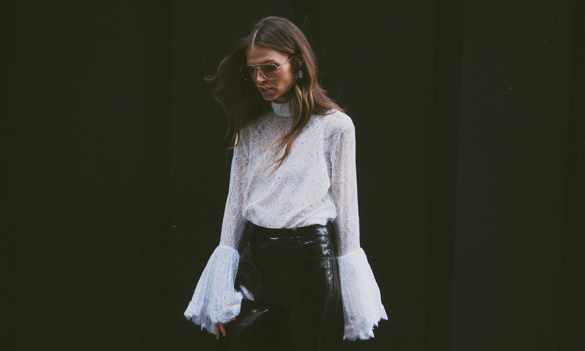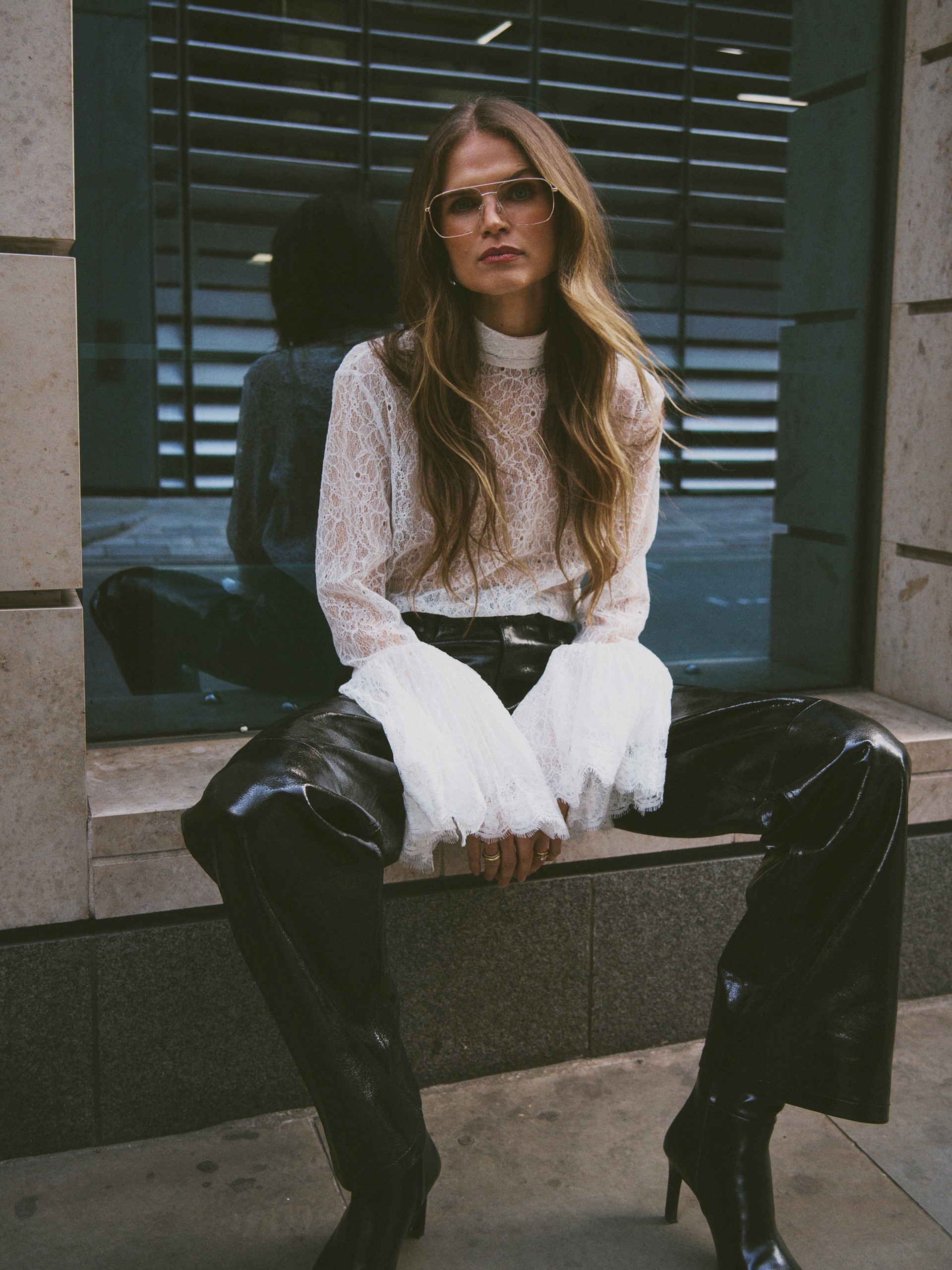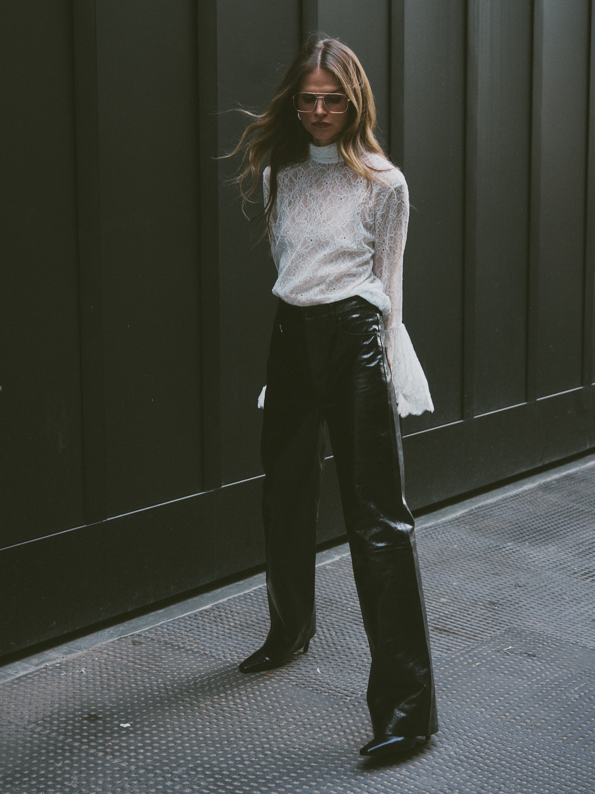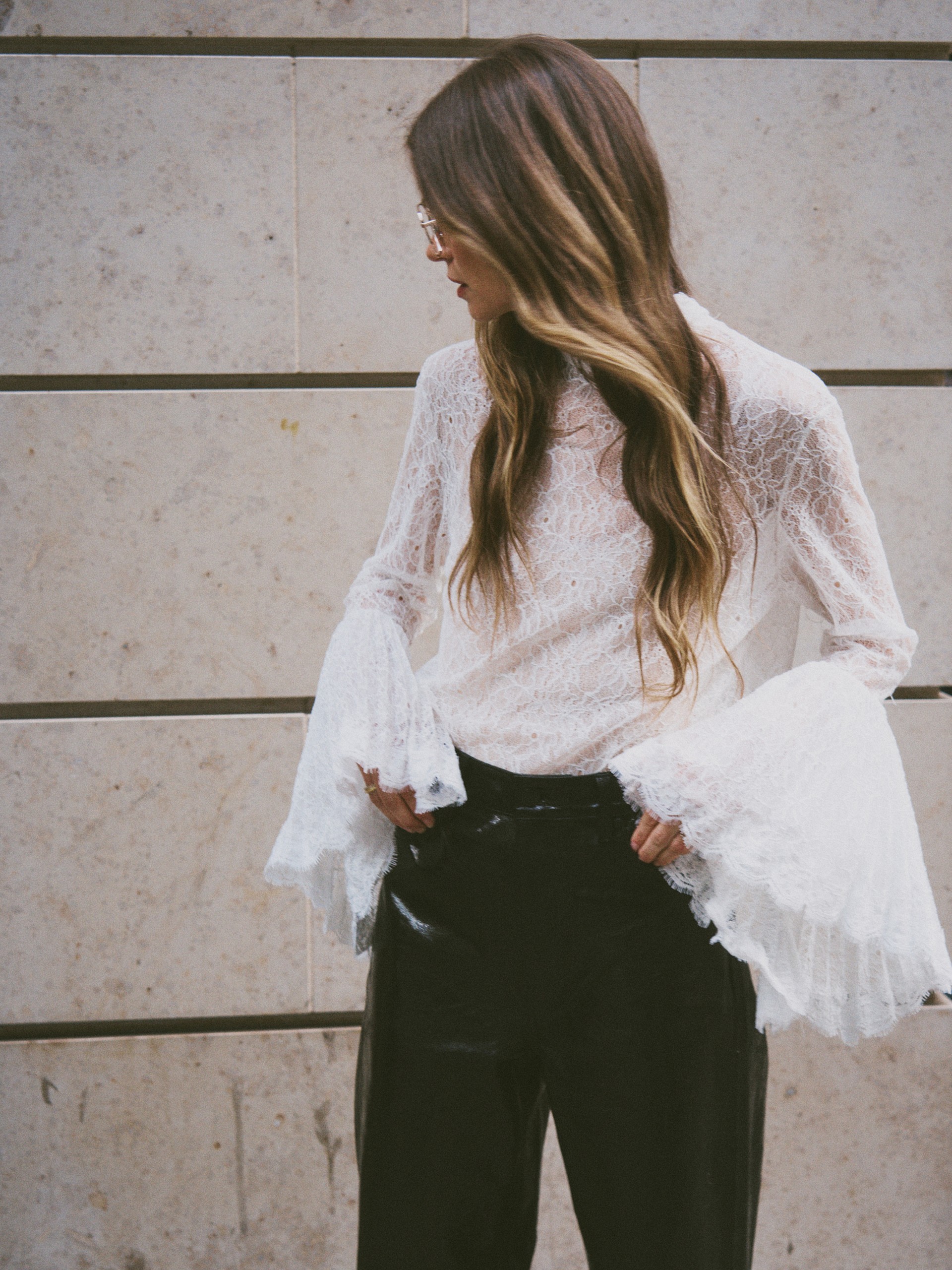 Lace with leather is ALWAYS THE PERFECT MASCULINE/FEMININE CLASH. THIS CHLOÉ-INSPIRED white top with black leather trousers makes for an easy, polished combo.