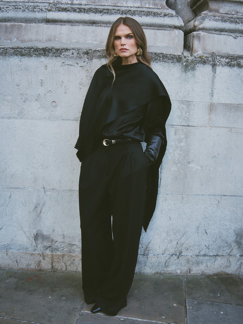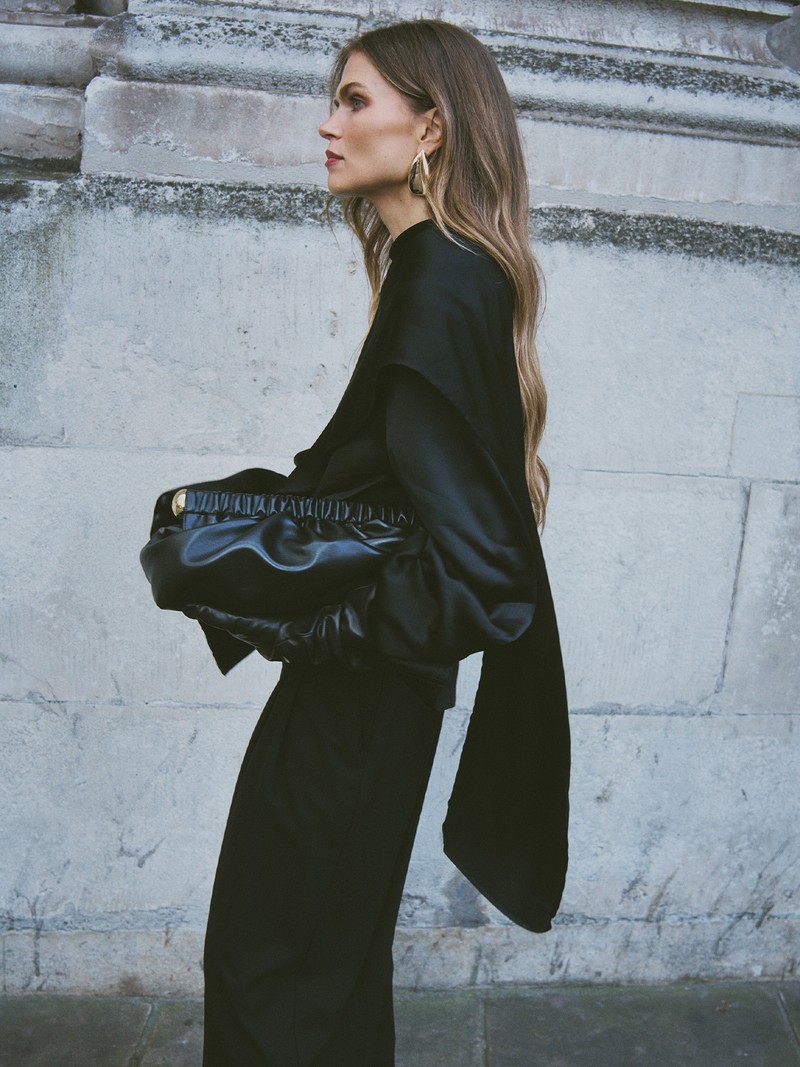 Strong and undeniably chic, this SILKY BLACK TOP – FRAMED WITH SHARP SHOULDER PADS – REDEFINES MODERN ELEGANCE by nodding to 80s power dressing.