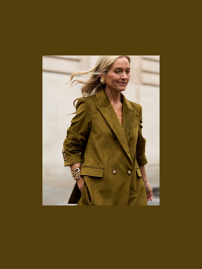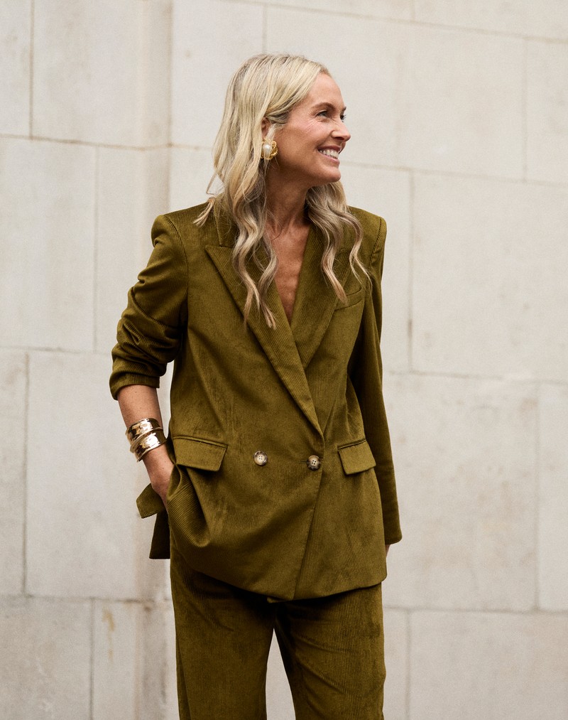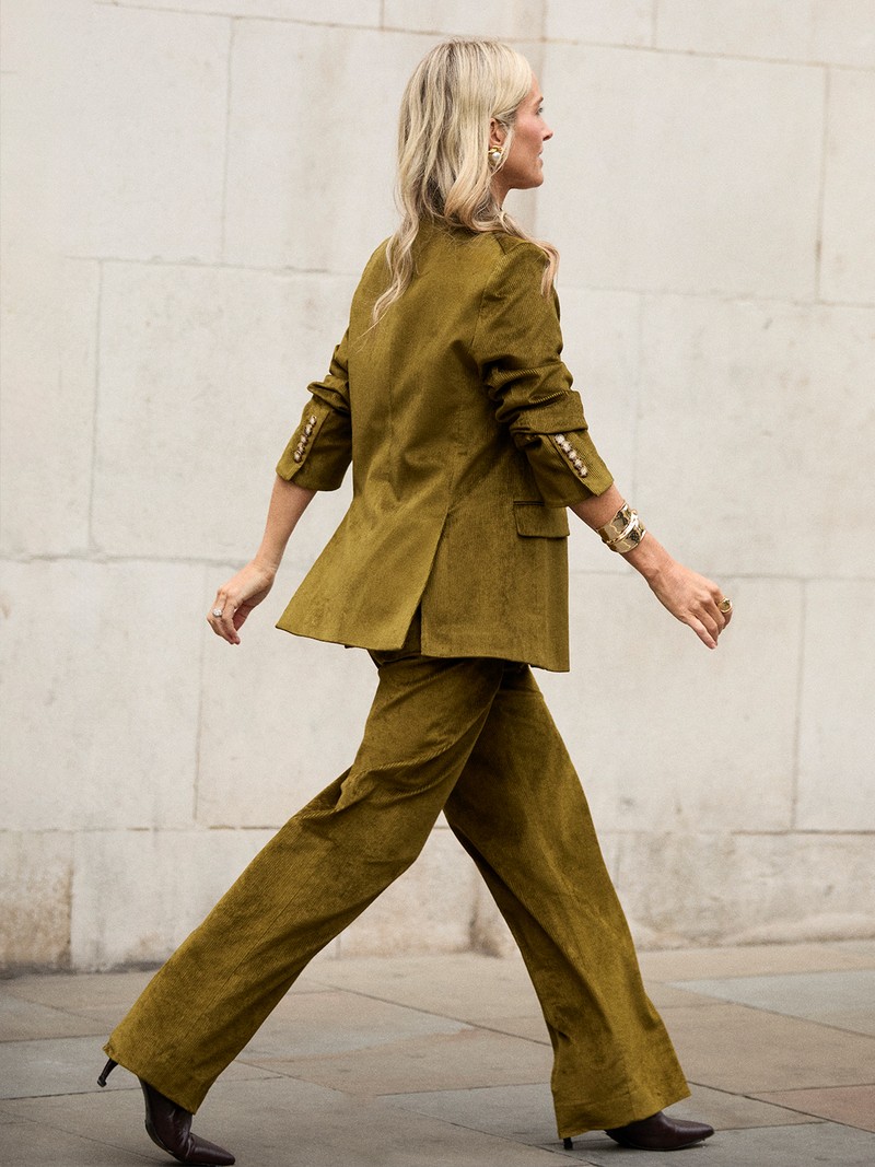 Wondering how to wear corduroy this season? This olive Veronica Beard suit is the perfect example of how to do it. The relaxed fit makes it effortless, while kitten-heel ankle boots from Massimo Dutti and statement gold jewellery add polish and warmth.