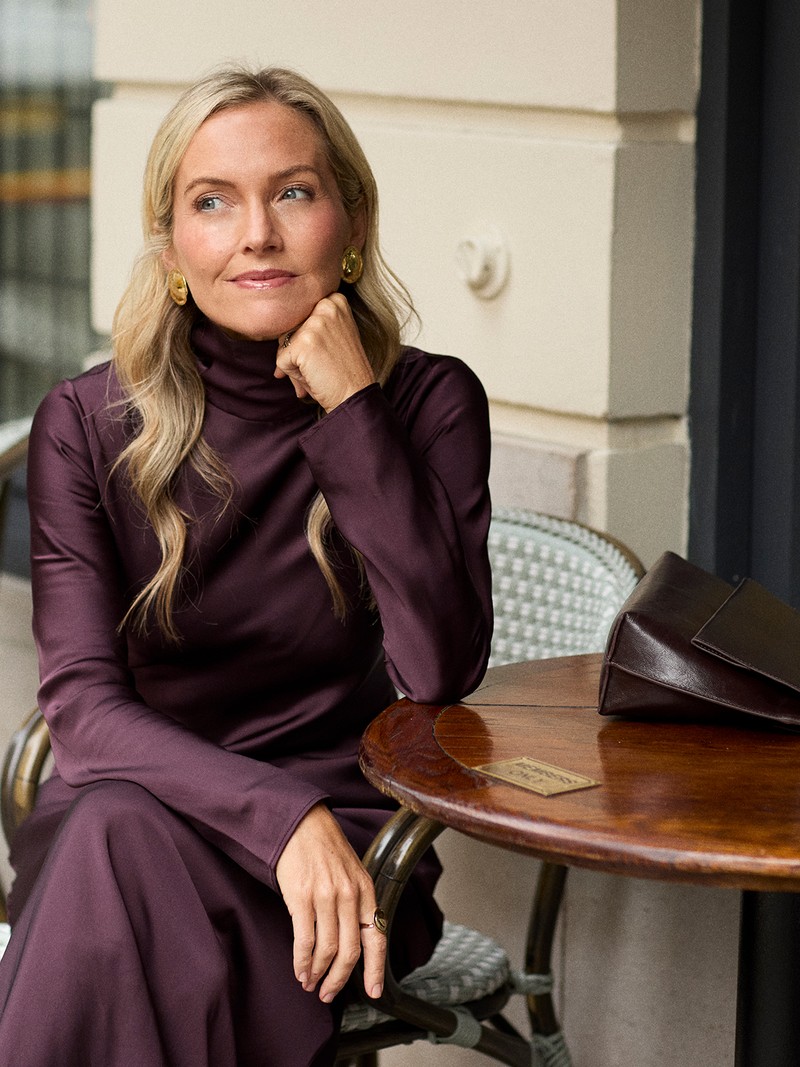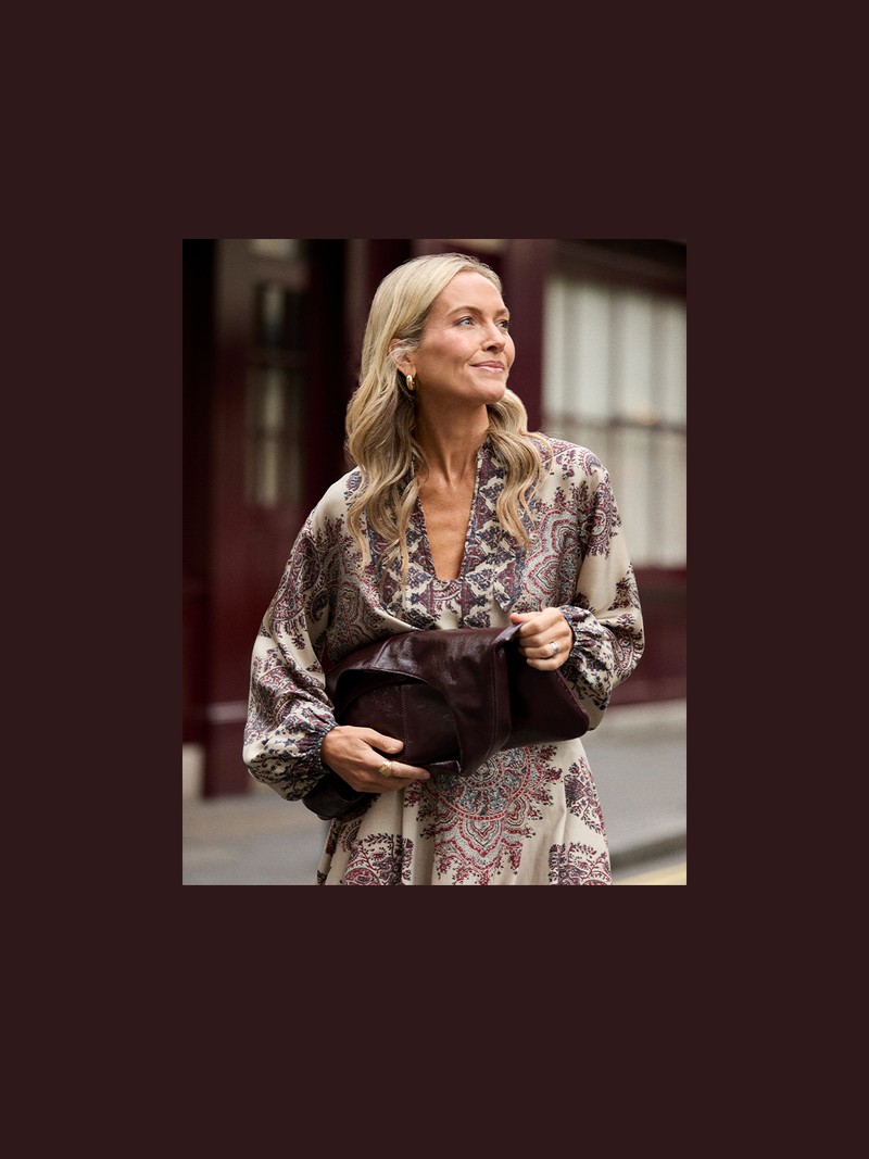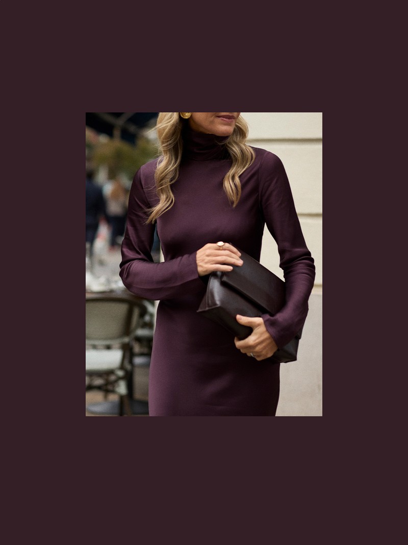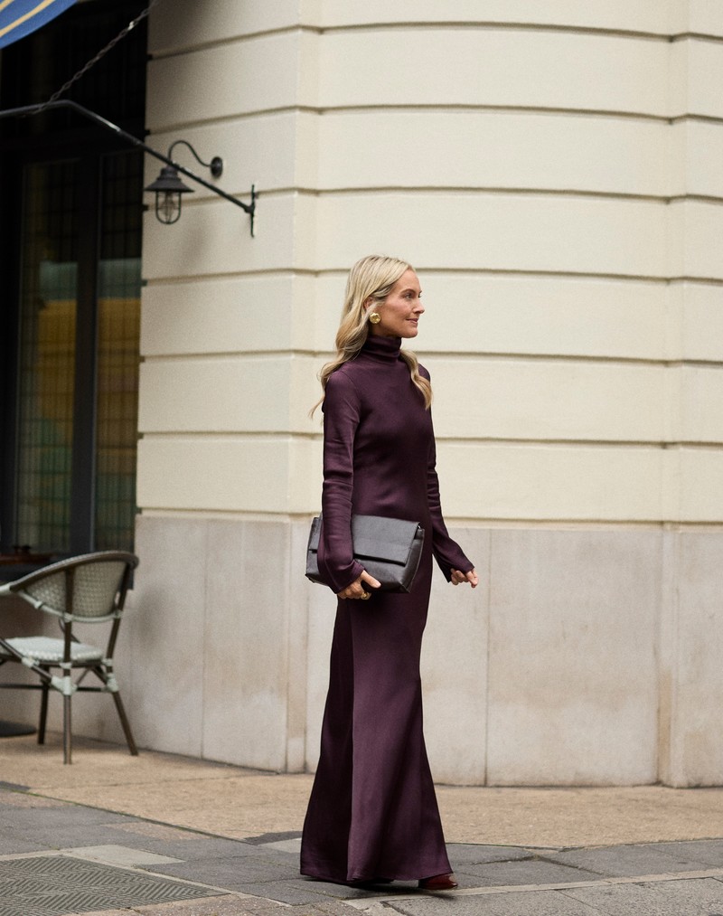 This full-length dress from Mango proves that simplicity can be the most striking statement of all. With its silky fabric and funnel neck, it has just the right balance between minimalism and impact, especially when paired with these patent heeled boots from Bobbies.