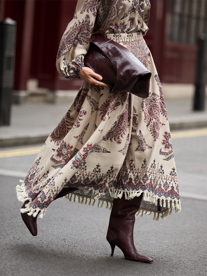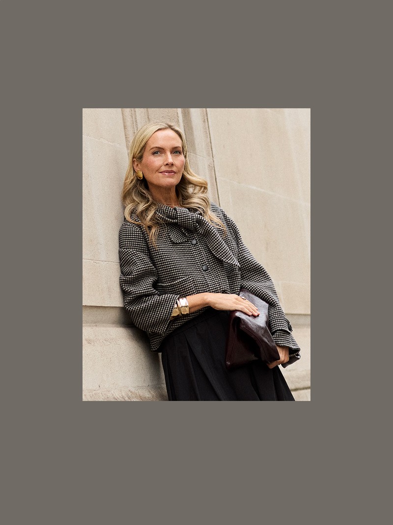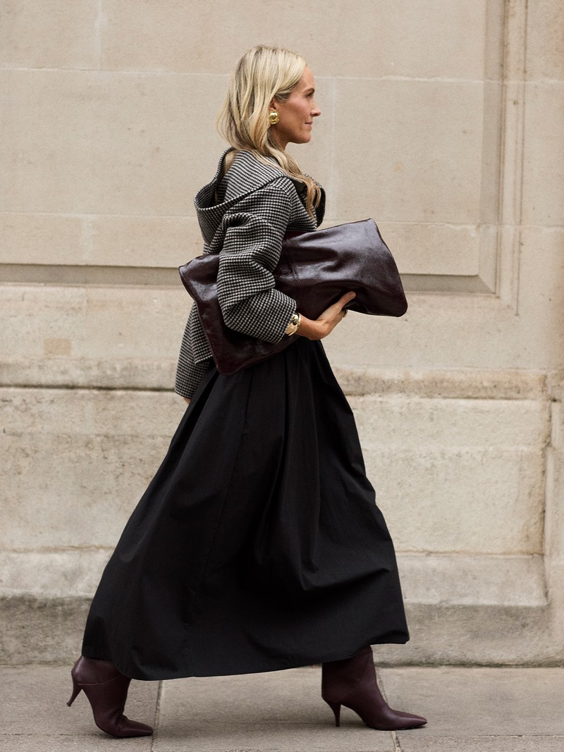 A short black and white houndstooth jacket from Sézane feels like the ultimate new-season hero. I love its detachable hood and tie-front detail – a clever twist on a classic. Here, I’ve styled it with a full black skirt from Stylein and long burgundy boots for a feminine and modern take on monochrome.