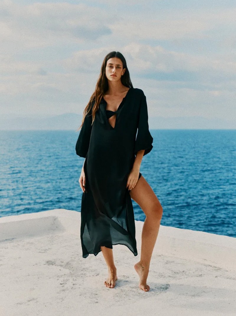 Cut from a fluid, 100% silk, Vanessa Sposi’s black kaftan dress is the kind of piece that works just as well poolside as it does for dinner. Effortlessly chic, it’s a versatile hero that proves black can be just as striking in the heat.