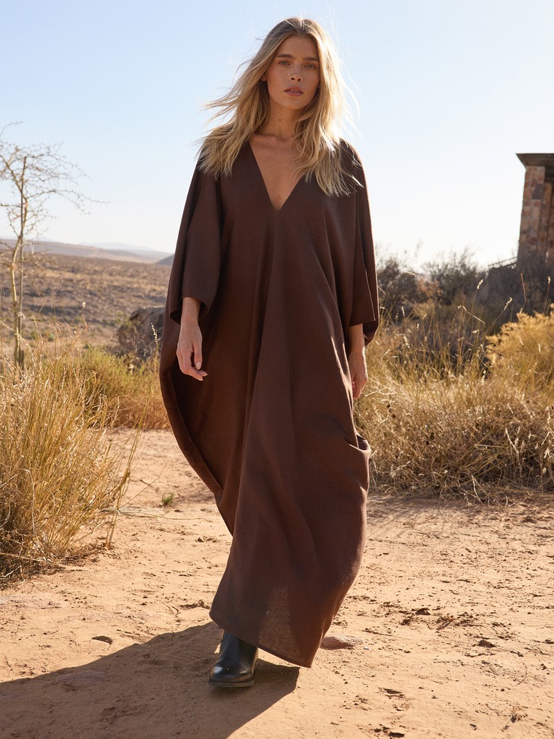 Pippa Holt’s kaftans celebrate her love of indigenous textiles. These hand-woven pieces take weeks to craft, with the panels sewn using a special macramé technique.