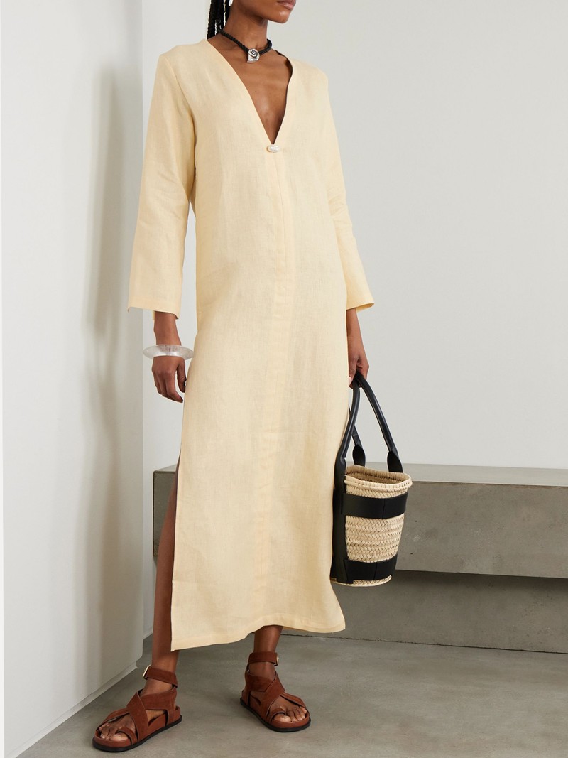 Drawing inspiration from the Venezuelan coast, Sara Cristina designs timeless pieces. This kaftan is made from linen and features flattering side slits and a freshwater baroque pearl.