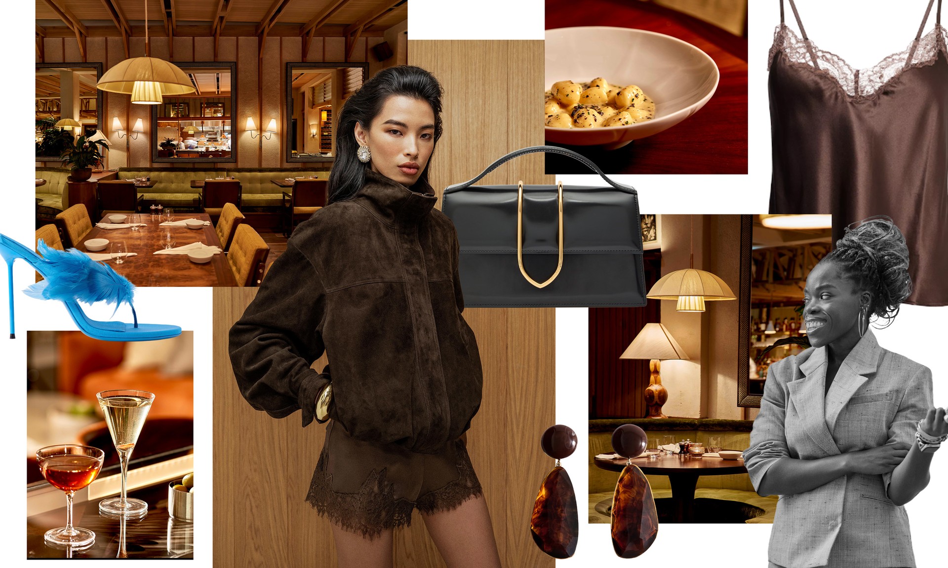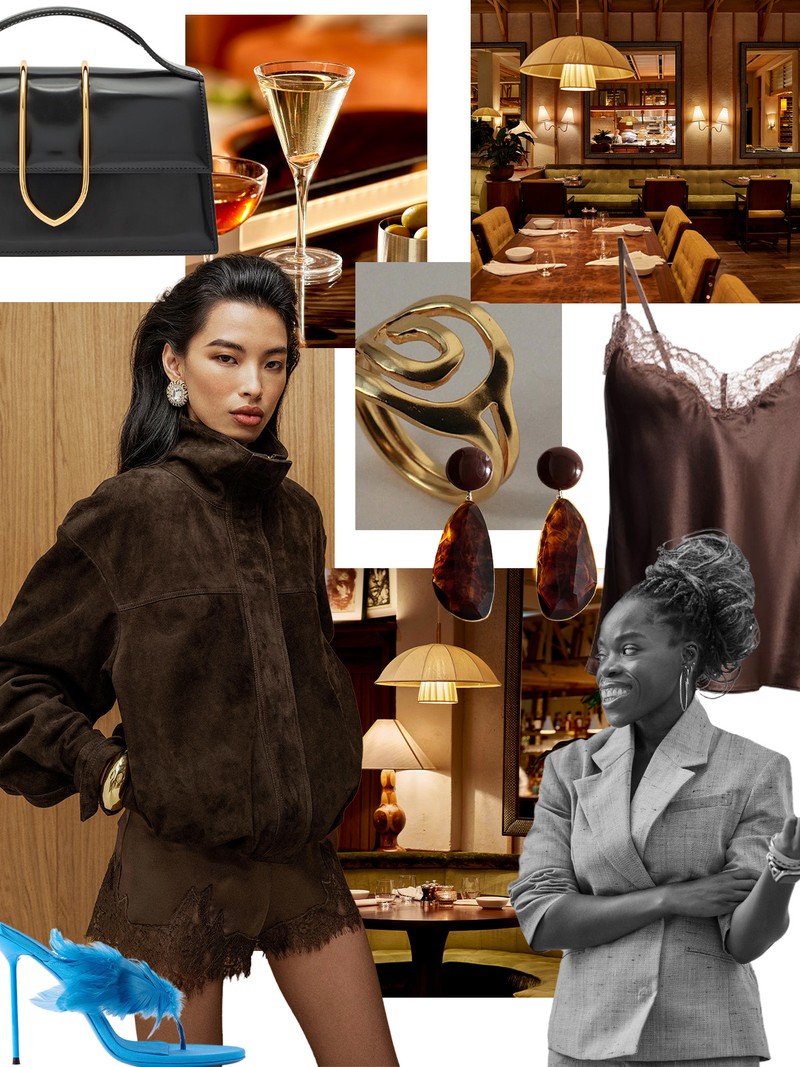 I’ve always believed the best date nights revolve around food and there’s something about slipping into silk and heading somewhere low-lit that just feels… indulgent. I’ve gone for chocolate-hued Reformation shorts with a funnel-neck jacket – effortlessly chic, but still fun. My turquoise feathered Paris Texas mules are doing all the talking because honestly, if a shoe isn’t making an entrance, what’s the point? A black mini bag and brown jewelled earrings make the look even more special. Dovetale in Mayfair has been on my list forever and I have a feeling the menu – and my outfit – will not disappoint.