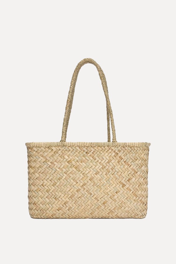 Q: I’m on the hunt for a small raffia or jute handbag for a beach holiday. I’m only taking hand luggage, so it needs to match multiple things and work for day or night.