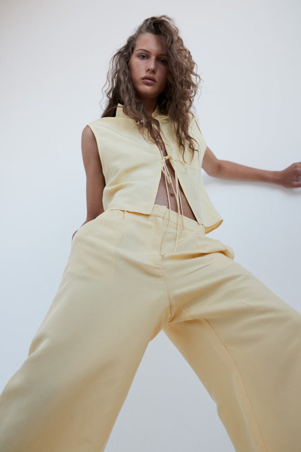 Matin uses soft, natural fabrics like cotton and linen. The colour palette takes cues from classic French aesthetics and retro neutrals, with a focus on whites, blacks, browns and blues, supported by subtle pastels and muted reds. Its wider aesthetic embodies the beachy spirit – a standout piece is the sunny yellow co-ord set. The slightly cropped shirt perfectly complements the wide-leg tailored pants that complete the coordinated look.