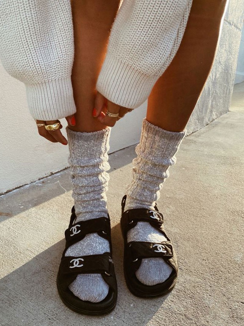 Chunky grey socks and cream sandals are a dream combo. Style them with loose denim and a new season mac for off-duty weekend vibes.