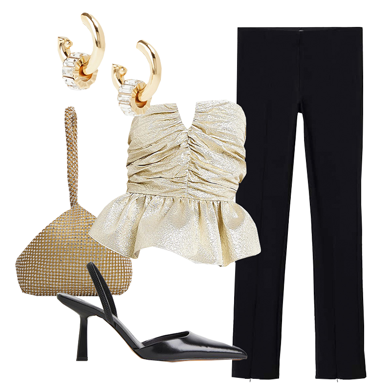 For an understated look, wear this pretty gold top with split-hem leggings. Add some polish with slingback heels and pull everything together with a gold bag.