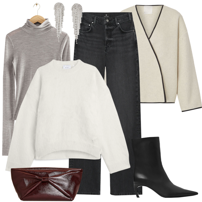 Layering is essential at this time of year, so team a long-sleeved rollneck with a crew neck jumper and add a cosy jacket for a minimalist base. Heels will make the oversized separates feel more wearable.