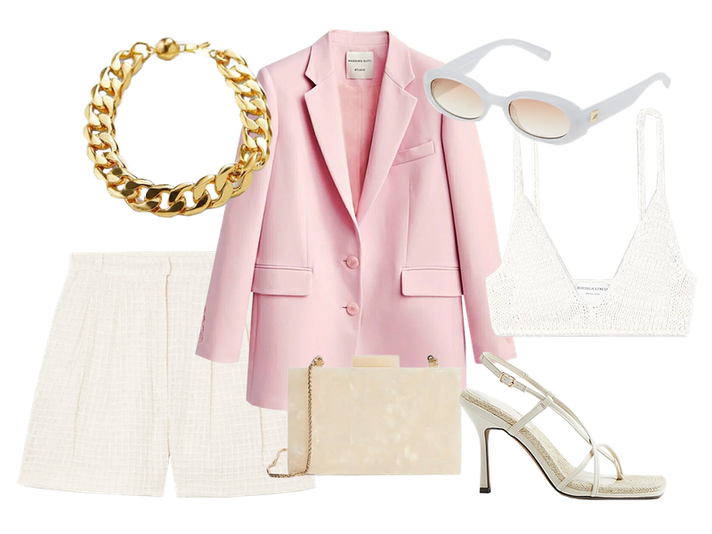 This Bottega Veneta crochet bra is perfect for adding a bit of texture to your summer evening look. Add white shorts, white strappy heels and a pink blazer for a touch of femininity. Mango’s pearlescent bag is the perfect finishing touch.