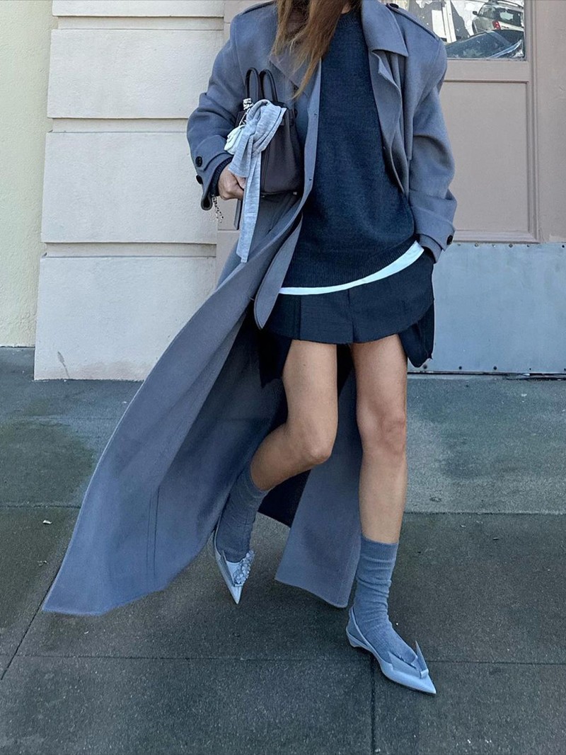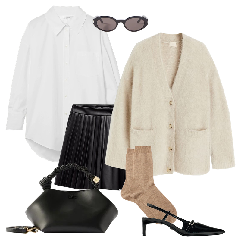 A pleated mini is a real hero this season. Wear it with an oversized shirt, a slouchy cardigan and a sock and kitten heel combo.