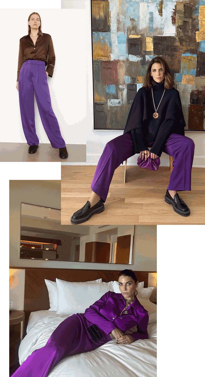 Purple is my colour obsession right now – especially in silk. It makes such a statement and it’s an extremely chic way to add some colour to your looks. I have a pair of silky trousers that I wear with a navy sweater and gold vintage jewellery.