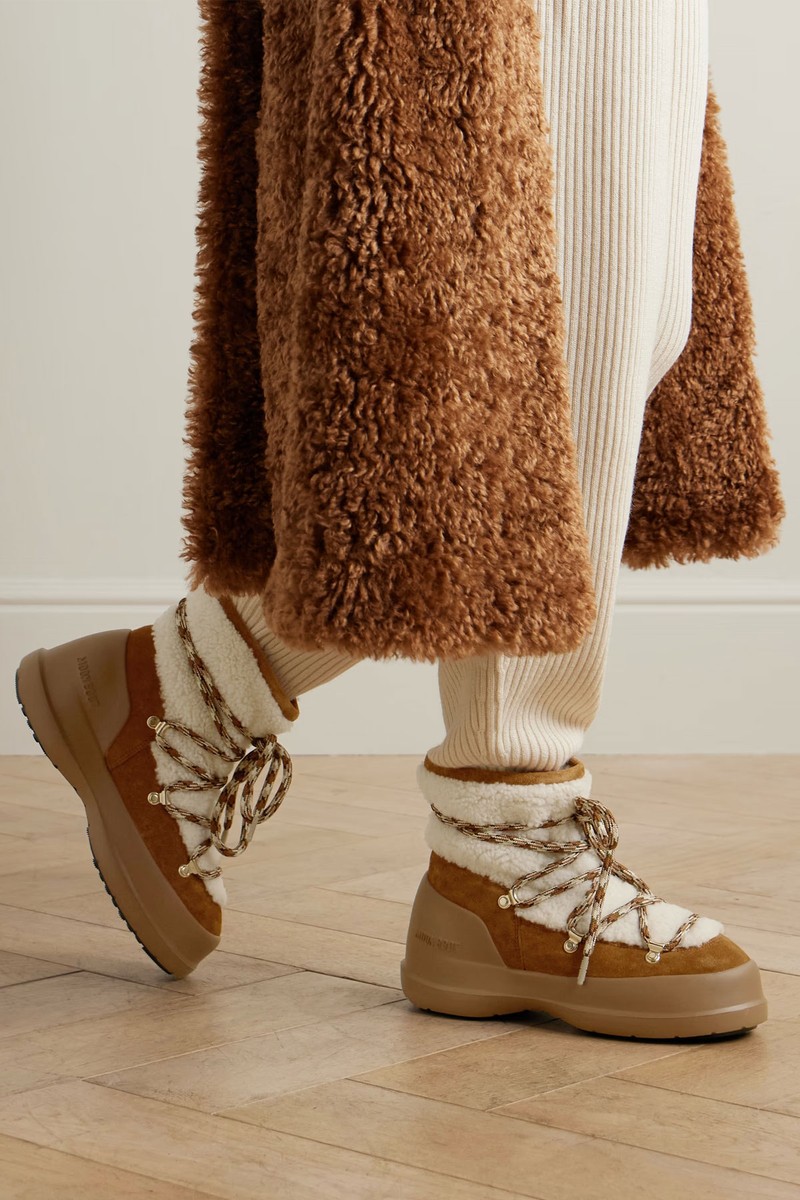 These Luna boots by Moon Boot are crafted from SHEARLING AND SOFT SUEDE. They are set on chunky rubber soles for traction and have a water-repellent coating that makes them PERFECT FOR WINTER ADVENTURES.