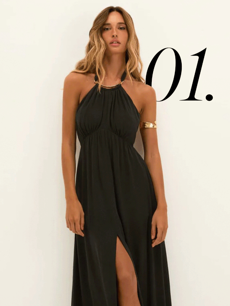 With its gold‑plated collar and front slit, the ViX Joy dress is effortless and elegant – its open back and tie‑neck add a touch of drama, making it a maxi you can rely on for sunset cocktails or late‑night dinners.