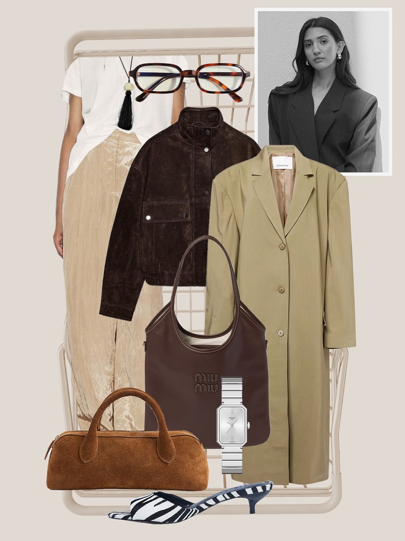 I’m well and truly ready for autumn – hence the excessive amount of brown and suede currently sitting in my basket. This Zara suede jacket is top of the list: the funnel neck is a shape I’ve been seeing everywhere and it looks so good with a pair of wide-leg tailored trousers. Elsewhere, tinted or blue-light glasses have become a bit of a styling hack for me – they add that little bit of interest. I’ve also got my eye on the Miu Miu leather tote. I invested in the larger cord version last year and didn’t regret it for a second – it’s the perfect work bag that also fits a laptop, so I think it might be time to pull the trigger again. Finally, I’m leaning into silver more than ever this season. This Tissot watch has that perfect mix of timeless style and modern edge – exactly the kind of piece that elevates everything else.