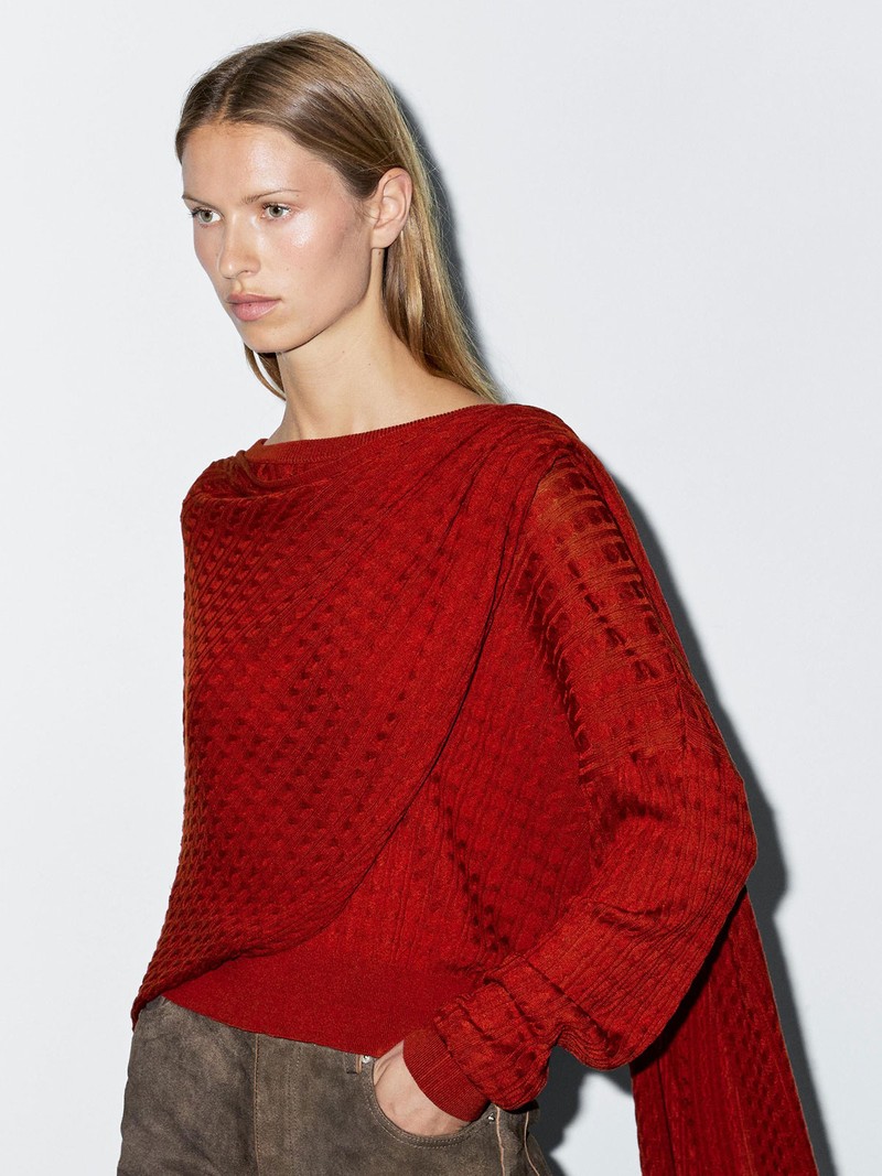 This knit sweater with scarf detail redefines layering, combining texture and function into one streamlined silhouette. The attached scarf falls naturally, offering built-in styling that feels intentional –no extra accessories required.