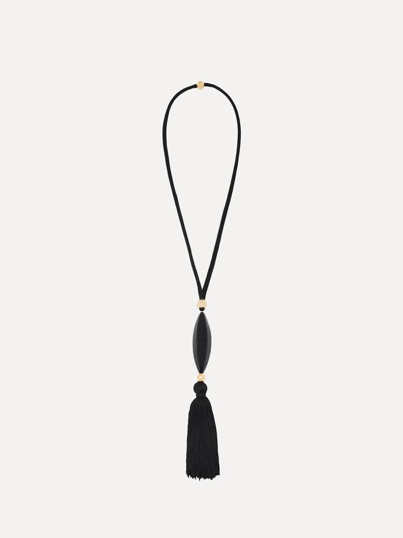 The deep, inky tone of this necklace feels quietly elegant, while the pendant adds a focal point and the tassel introduces subtle movement.