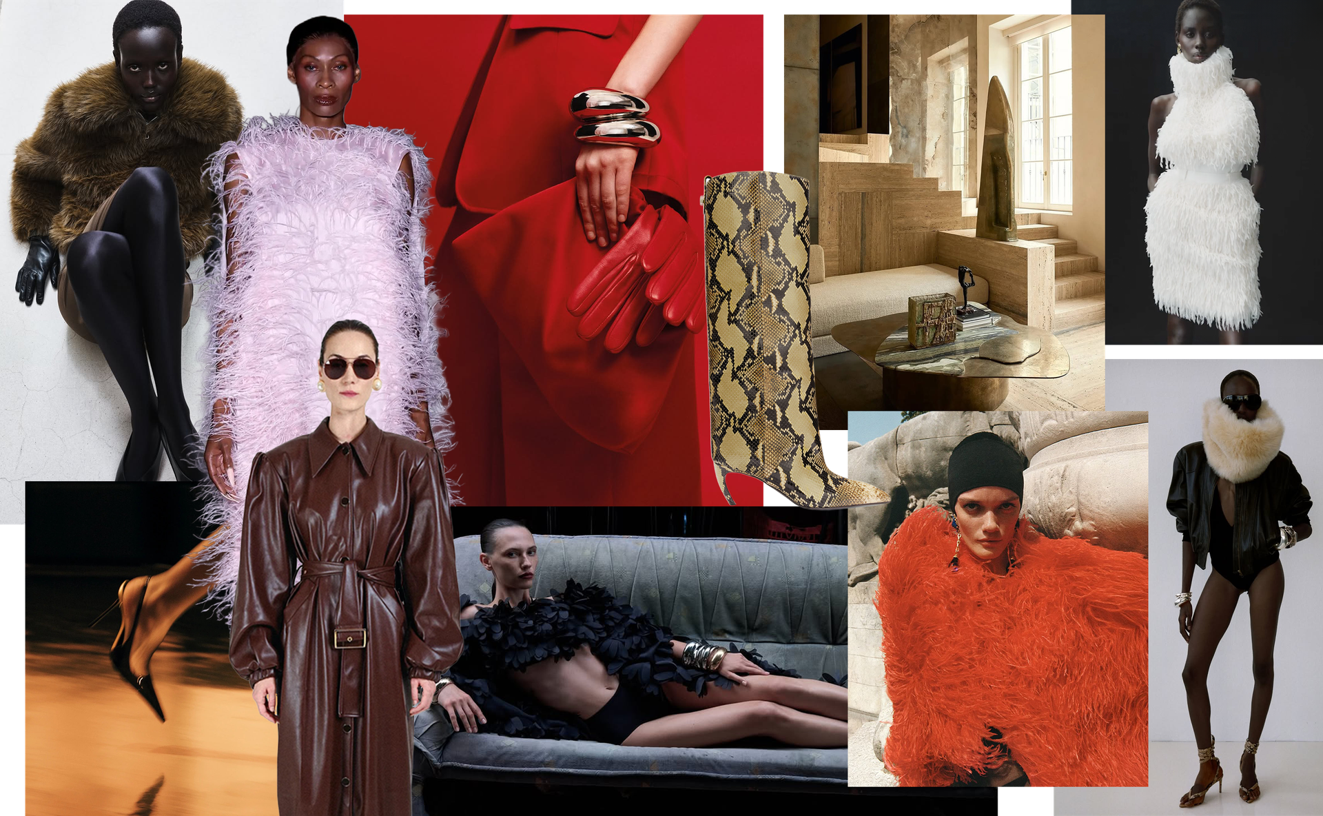 This season, my moodboard is driven by drama and contrast. I’m drawn to exaggerated textures like feathered dresses and plush faux fur, offset by smart leather and sharp tailoring. There’s something powerful about balancing softness with structure, whether that’s a sculptural coat worn over sheer tights or a minimal silhouette elevated by statement accessories. Colour-wise, I’m gravitating towards rich reds, chocolate browns and black, anchoring everything with strong heels and polished hardware. It’s about creating looks that feel directional and fashion-led, while still remaining wearable in real life.