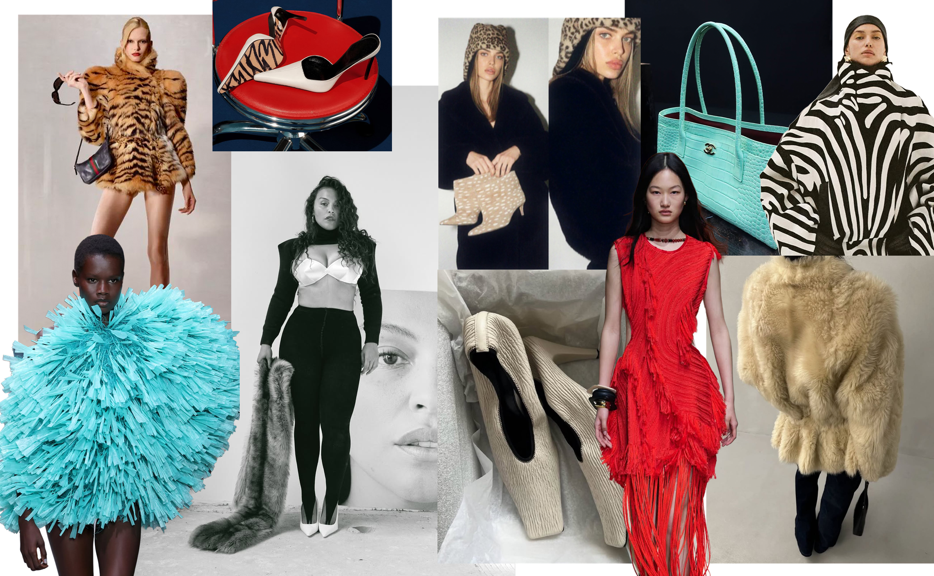 My moodboard is all about reconnecting with the things in fashion that genuinely excite me right now. It’s a chance to take stock of what I’m gravitating towards and, more importantly, work out why. If there’s one clear takeaway, it’s texture. I can’t get enough of it. Any piece where the fabric has been manipulated – whether that’s through pleating, ruching, feathers or clever cutting – instantly grabs my attention. It’s that added dimension that elevates even the simplest silhouette and makes an outfit feel considered rather than throwaway. Also, my long-standing love affair with animal print is showing no signs of slowing down. From classic leopard to bold zebra, it continues to be a wardrobe staple but this season I’m also embracing bambi prints – a softer, more playful take that still delivers impact. When it comes to colour, teal and green are the shades I keep coming back to. Both feel rich, confident and timeless, while still adding interest to winter looks.