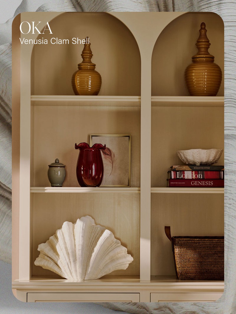 Ready to inject some seasonal accents to your shelves? The Venusia Clam Shell from OKA is a beautifully sculptural decorative object that instantly adds understated coastal elegance. With its softly contoured, organic form and off-white finish, it has the feel of a found object reimagined for the home – refined, tactile and quietly impactful. Its scale makes it ideal for styling moments where you want a piece to feel intentional but not overworked. On a shelf, it works best when given breathing space, allowing its silhouette to sit slightly off-centre for a stylised look, or layer it against contrasting finishes – think aged wood, linen or patinated brass – to enhance its presence while keeping the overall scheme relaxed and effortless.