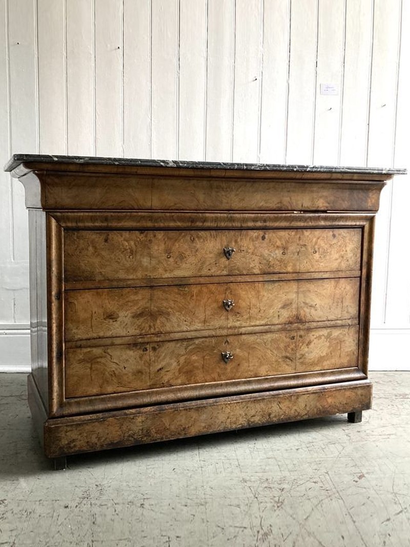 A strong, statement piece, this fine Louis Philippe walnut commode has book-matched veneer on the front drawers, a St Ann grey marble top and fixed keys. There are a few age-related dents – to be expected as it dates back to c.1830. Perfect for a living space with a drinks tray on top.