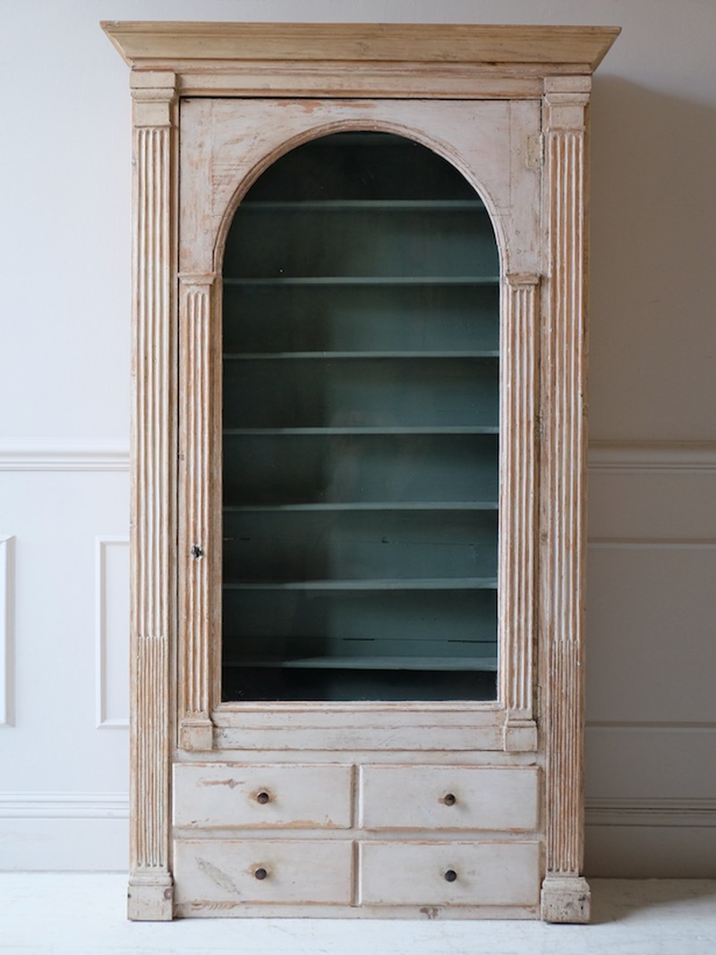 This French neo-classical display cabinet has an attractive arch and pillar detailing. With numerous painted shelves and useful drawers, we love the contrast of the linear shelving with the architectural details of the moulding. It can also be wall-mounted.