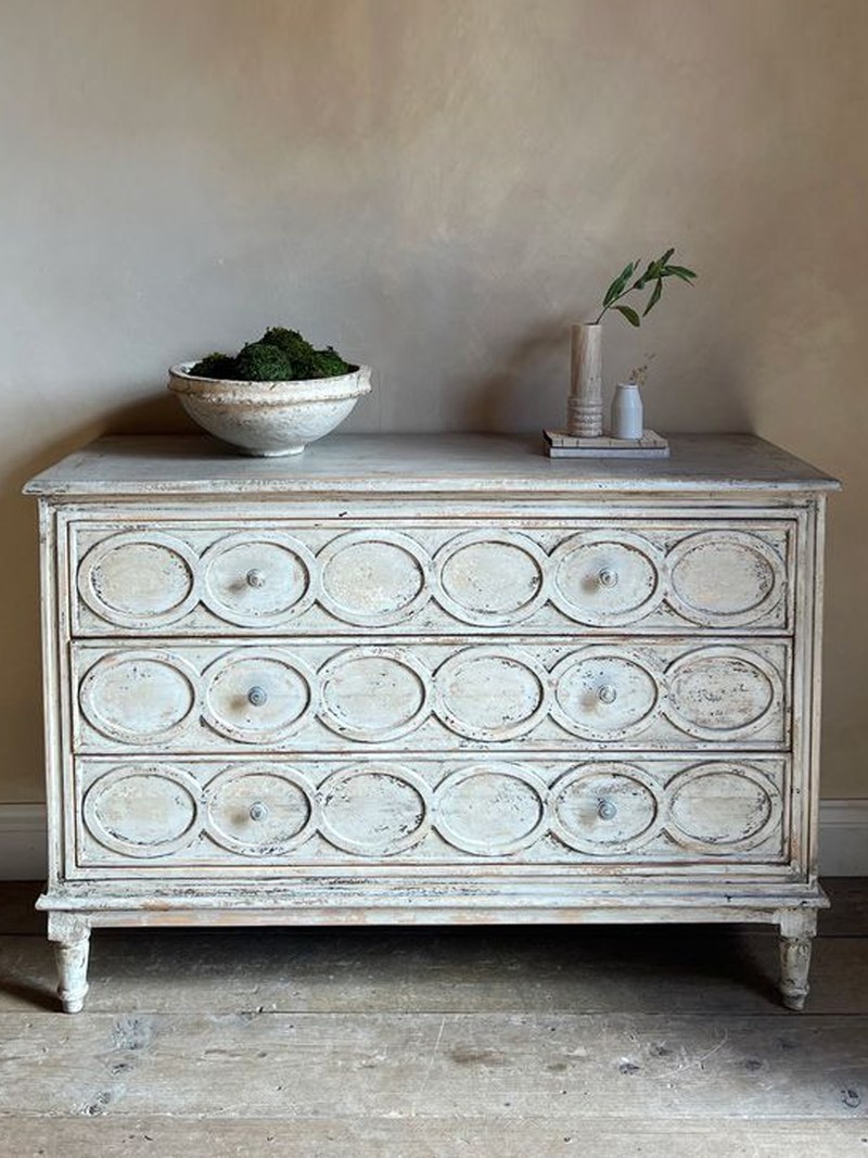 This beautiful and practical antique-style chest of drawers is made from solid elm timbers with imperfect distressed paintwork. We love the circular detailing and warm shabby finish. Ideal for any room in the house, we'd style this eye-catching piece in a dining room and use it to store placemats and napkins.