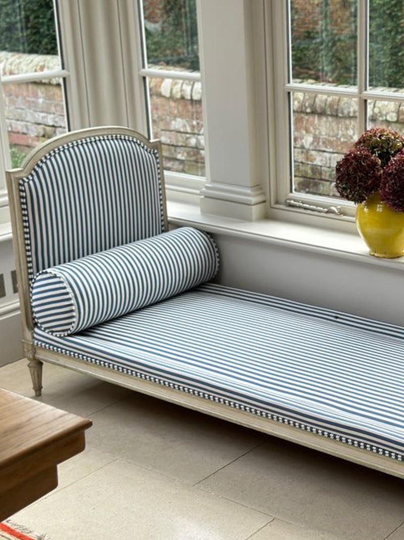 This charming daybed has been newly upholstered with a booster pillow in a crisp ticking fabric. The piece would look chic in a bedroom or in a window, or if you have a wide hallway, it could work perfectly there. Handily, it comes apart into three pieces and can be flat packed and sent internationally.
