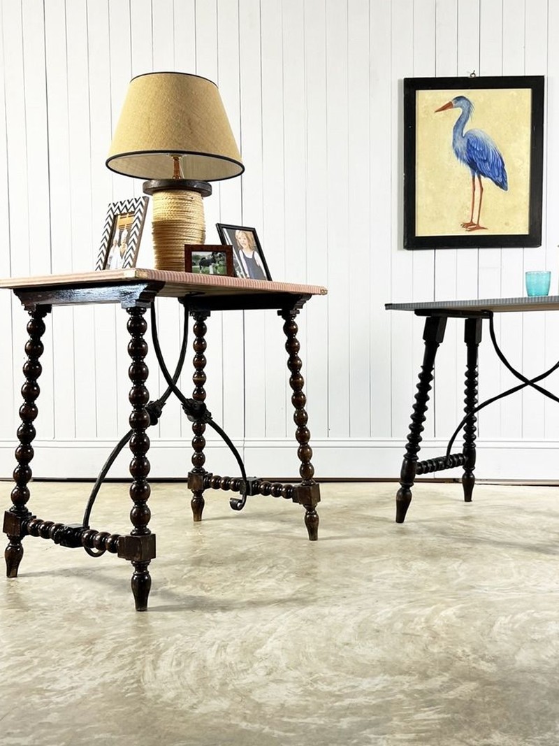 These antique bobbin-legged tables are mid-19th century. Typical of smart houses of the period, they would have been used as bases for Barqueno chests holding writing equipment and jewellery. The tops have seen better days, so they've been covered with Colefax & Fowler fabric.