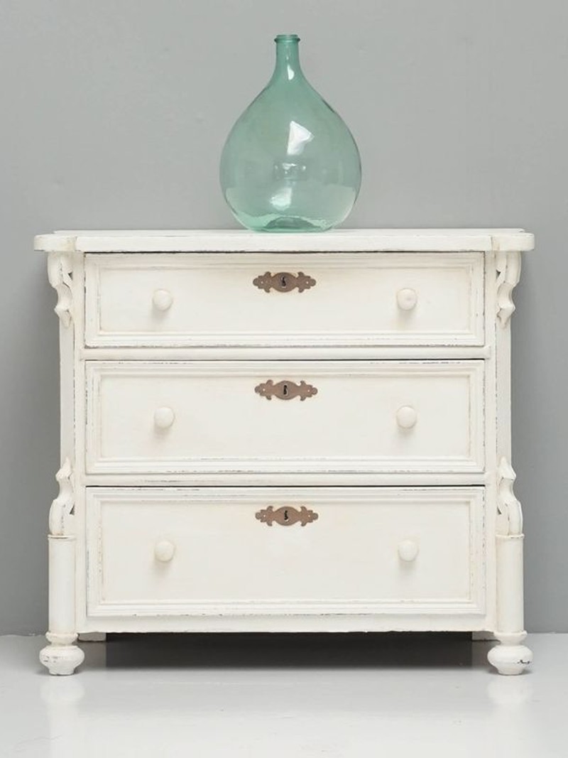 Continental in style, this chest of drawers has been repainted in a chalk white finish and has decorative brassware. With three generous drawers, it would be ideal in a child's bedroom or as a storage space for bedlinen.