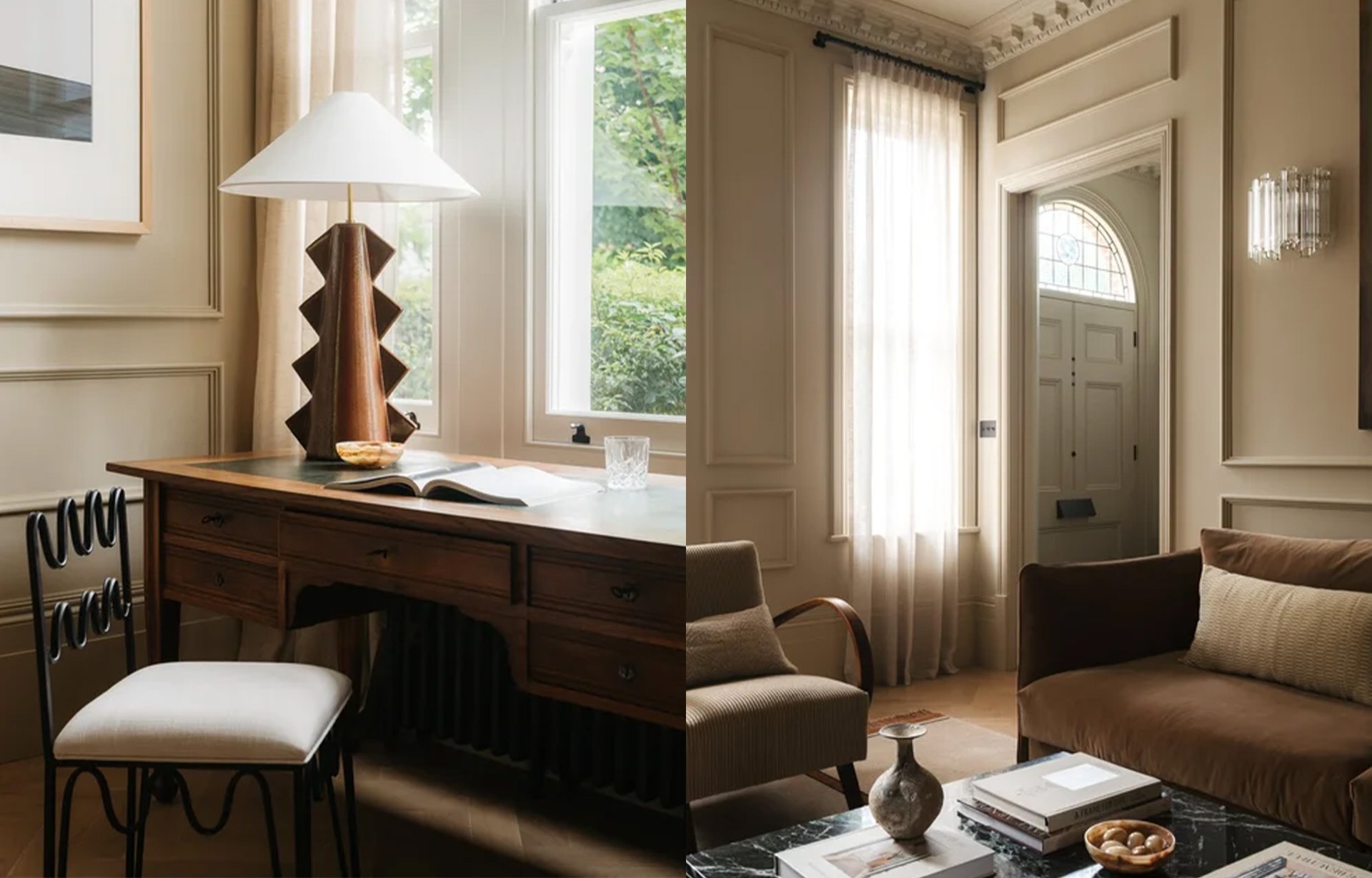 We focused on rich, textural finishes in calming tones. The walls are painted a warm mid-brown (F&B 'London Stone'), paired with a hazel brown velvet sofa that complements the client’s own artwork, pale green mohair cord armchairs and a marble-topped coffee table.