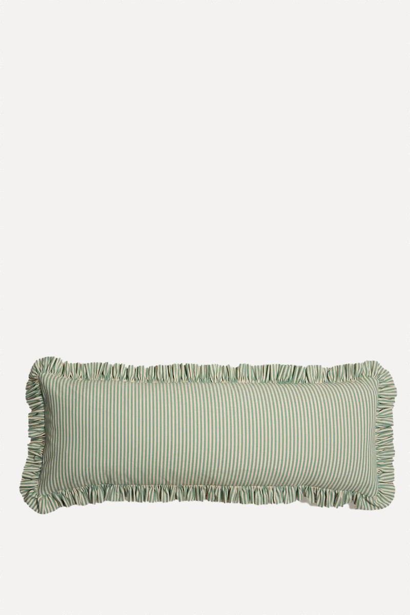 I used to layer about six cushions on my bed, with a bolster and a throw in tow. Making it therefore took longer than my make-up routine, so when I saw this oversized, ruffle-finished striped cushion, I streamlined – although the throw was allowed to stay. It’s high on impact and so much lower on maintenance.