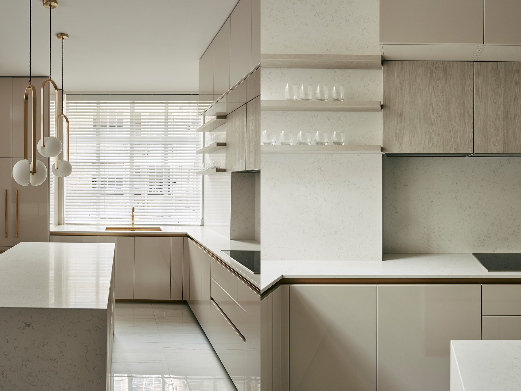 The brief was to create a functional eat-in kitchen. We chose to work with an Italian manufacturer, Arredo 3. Its quality is very good and it’s economical, creating stylish kitchens without breaking the bank. We designed the kitchen in-house at Base Interior, working with the Arredo 3 modules so this is a semi-bespoke kitchen. It is formed from a mix of lacquer cabinetry with some veneered doors as accents, a manmade quartz worktop and brass handles, grip rails and plinth board, which are a link to the antique brass ironmongery used throughout the apartment. The lighter tones and the mixture of finishes create a feeling of warmth that is present throughout the home.