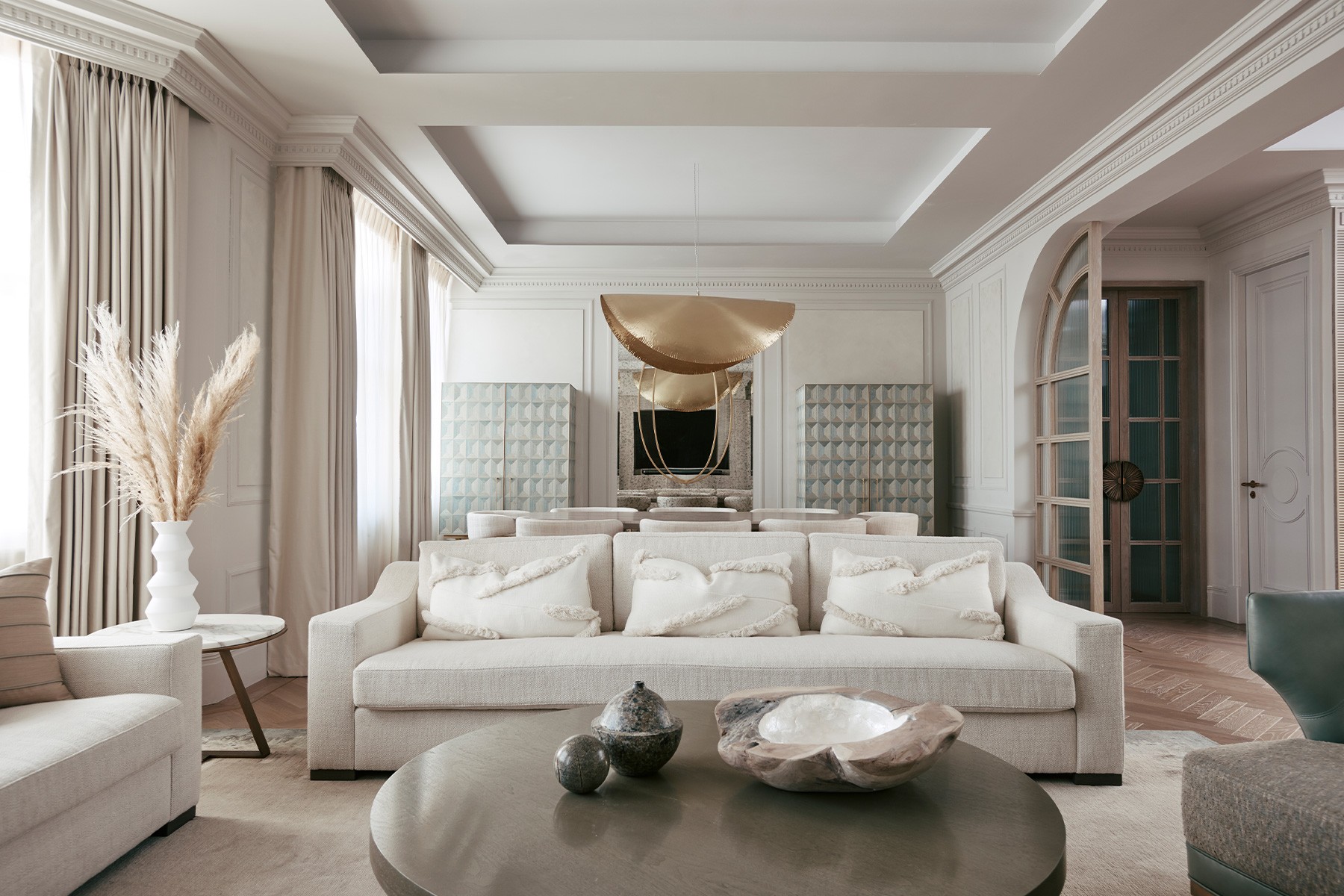 The client was keen for a neutral palette and the building does lend itself to lighter tones as the architecture is very solid. The warmer tones are kept contemporary through the use of texture and pattern. Bolder colour is introduced in the upholstered furniture and soft furnishings, including cushions and curtains.