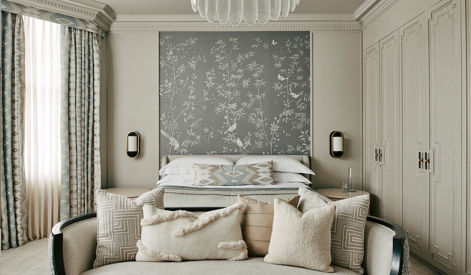 We chose a shaped headboard which is attached to and wraps a little around the bed, rather than a straight wall-mounted headboard. This allowed us to use a beautiful De Gournay silk wallpaper as a centre panel. I’m not usually keen on a feature wall, but this works well in balancing the room and creating symmetry in the space that is left from the bay window.