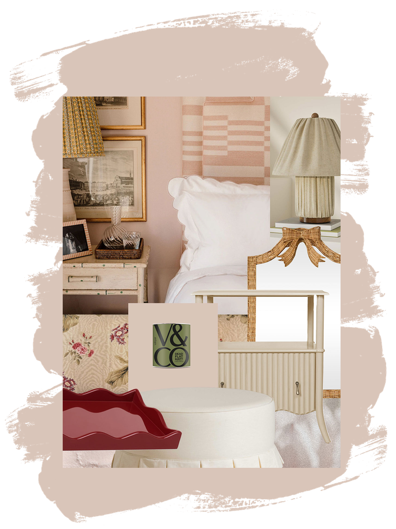 A soft pink is one way to create a cocooning bedroom. Layer it with natural materials, including rattan and linen, then add a surprising pop of red with a lacquered tray. Not only does it ground the scheme, but it also takes it from saccharine sweet to sharply sophisticated.
